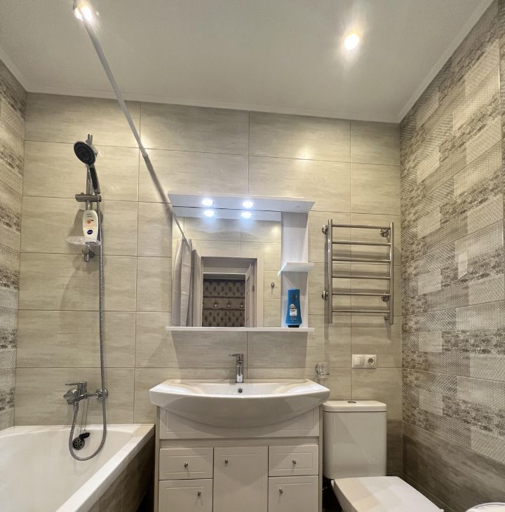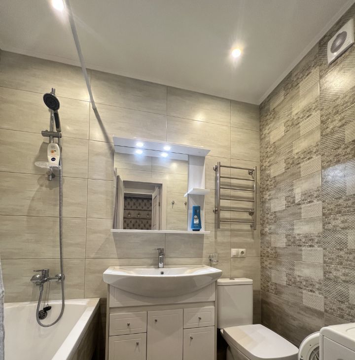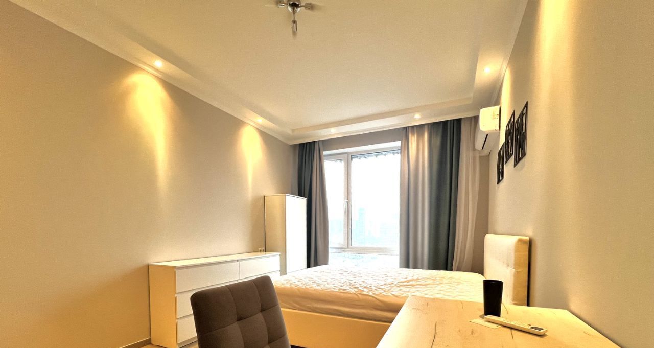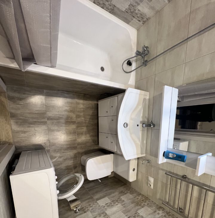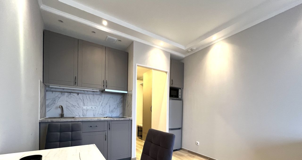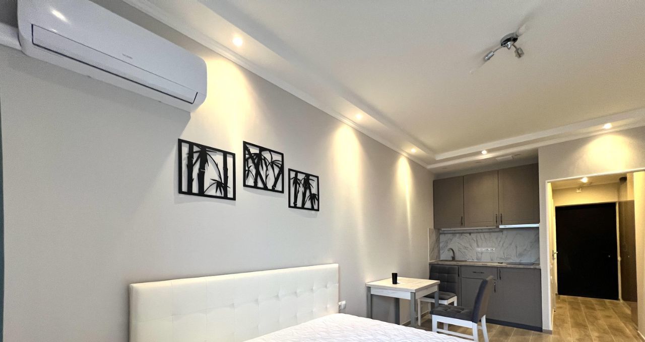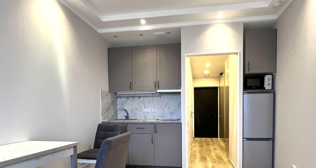 В апартаментах выполнен евроремонт, создающий уютную и стильную атмосферу. В студии есть вся необходимая мебель и техника: кондиционер, холодильник и стиральная машина, так что вам не придется беспокоиться о покупке бытовых приборов. Санузел совмещённый, с ванной, что добавляет комфорта в повседневную жизнь. Окна выходят во двор, поэтому в квартире тихо и спокойно.