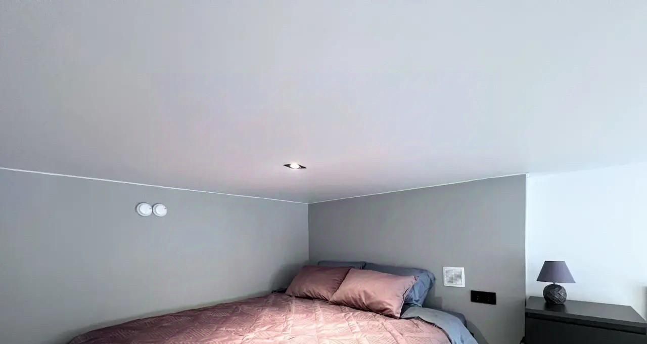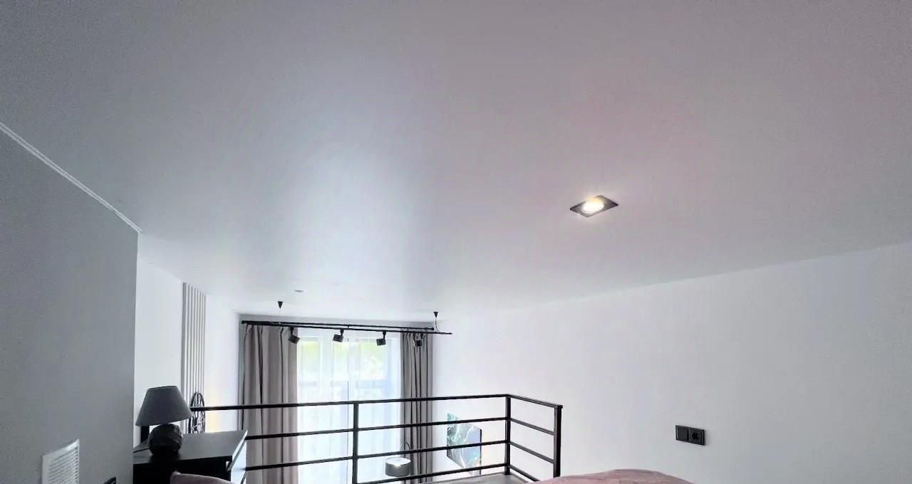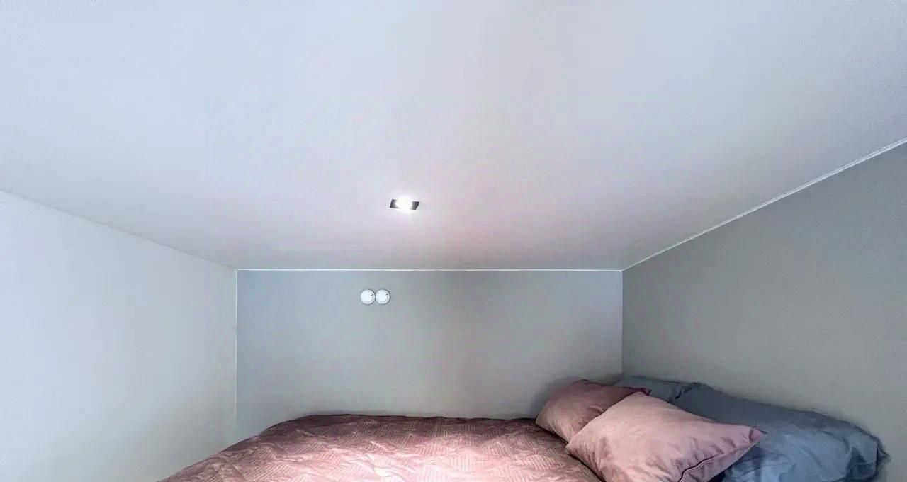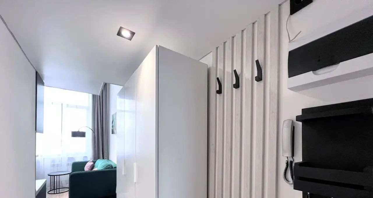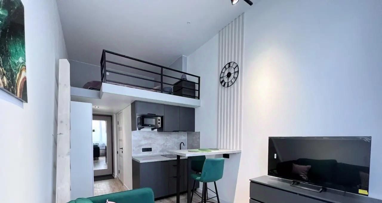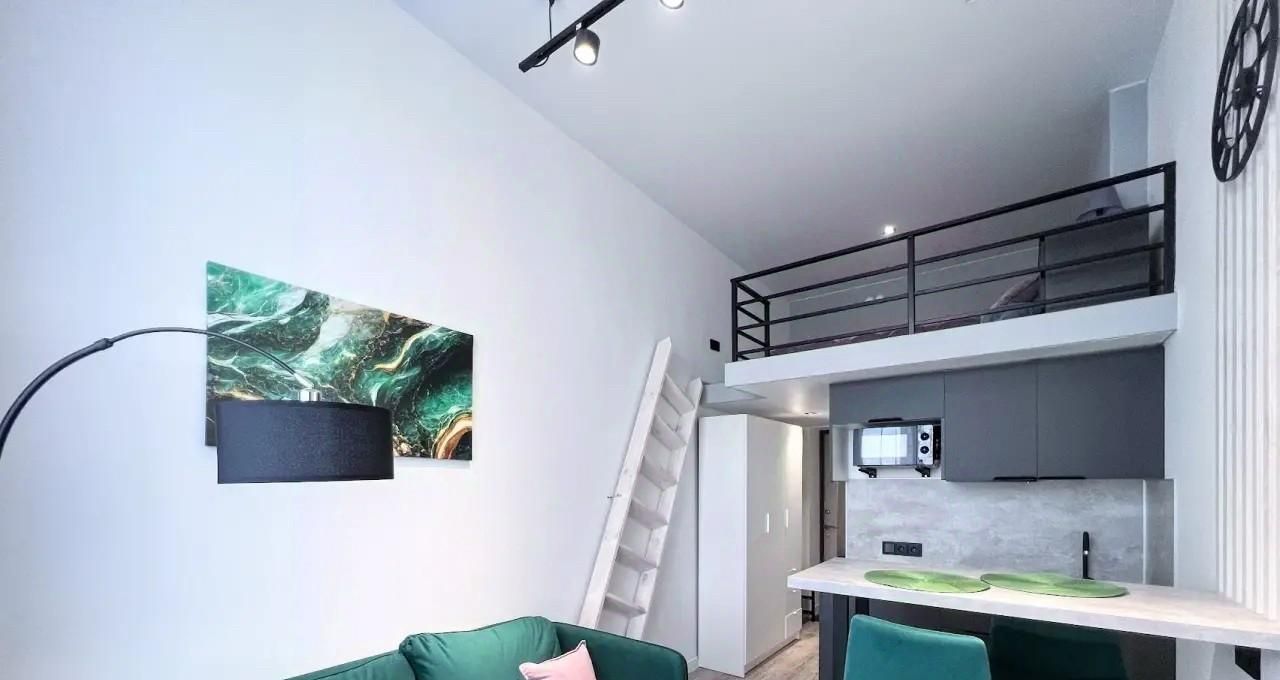 Студия оборудована всей необходимой мебелью и бытовой техникой. На первом уровне (16 м2) располагается зона кухни-гостиной, прихожая, совмещенный санузел с душевой кабиной, на антресоли (6 м2) двуспальная кровать.