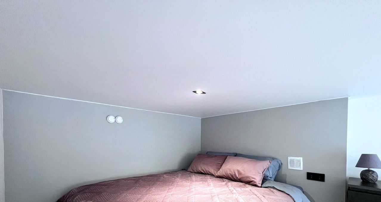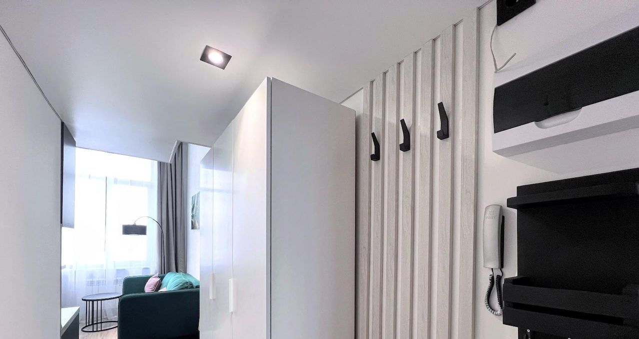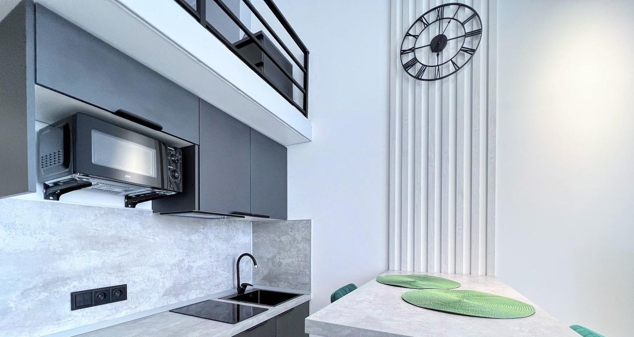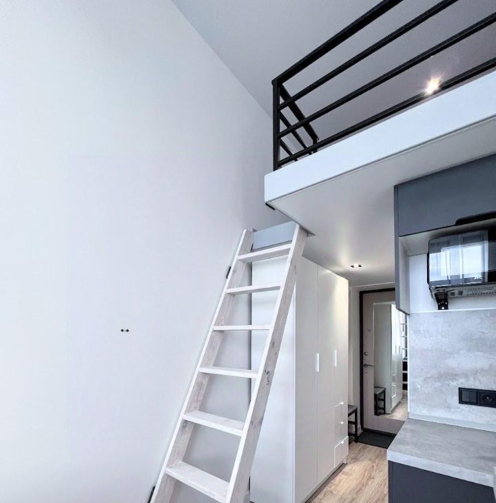 Студия оборудована всей необходимой мебелью и бытовой техникой. На первом уровне (16 м2) располагается зона кухни-гостиной, прихожая, совмещенный санузел с душевой кабиной, на антресоли (6 м2) двуспальная кровать.