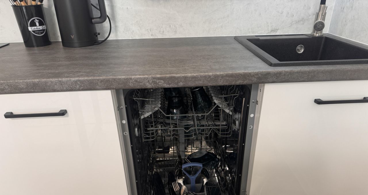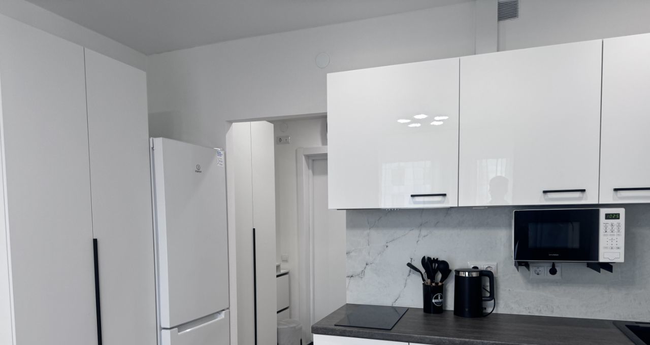 Квартира укомплектована мебелью и техникой: стиральная машина, посудомоечная машина, варочная панель, вытяжка, холодильник.