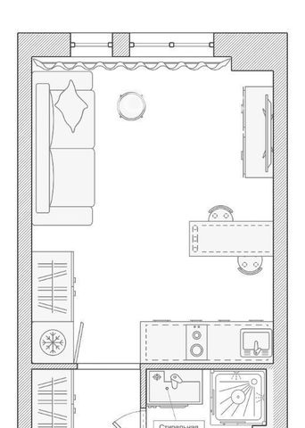 - зона для сна и отдыха (удобный раскладной диван, телевизор и комод, журнальный столик, шкаф для хранения)