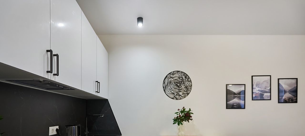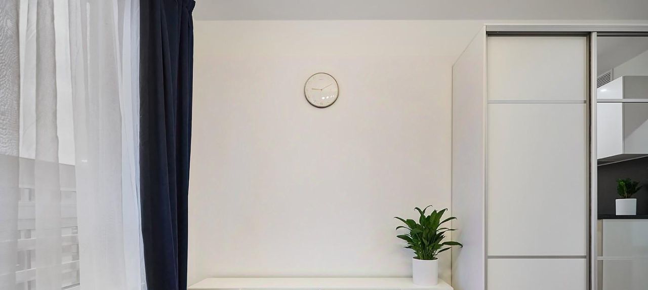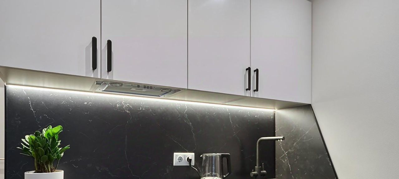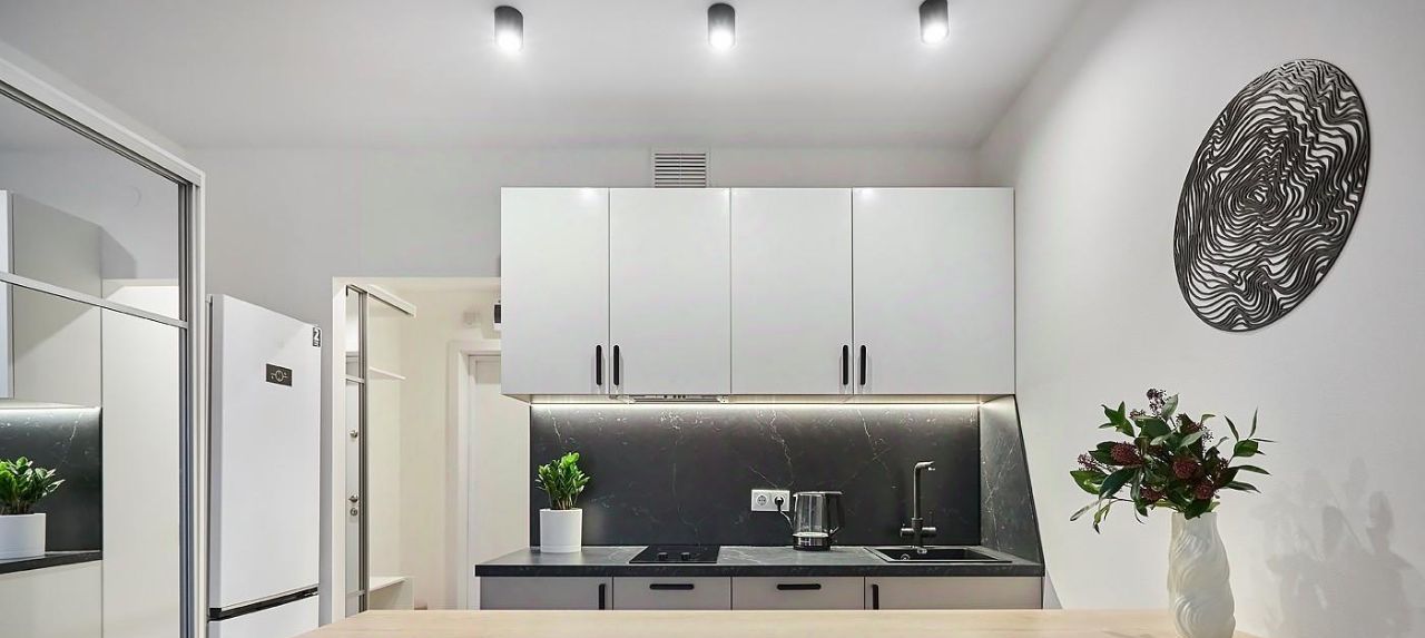Квартира выполнена в современном стиле в светлых, синих и темных тонах, с обилием зеркал и большим количеством мест хранения. В студии несколько источников света: "споты" с холодным, нейтральная LED подсветка от кухни и люстра с теплым, вечерним освещением.