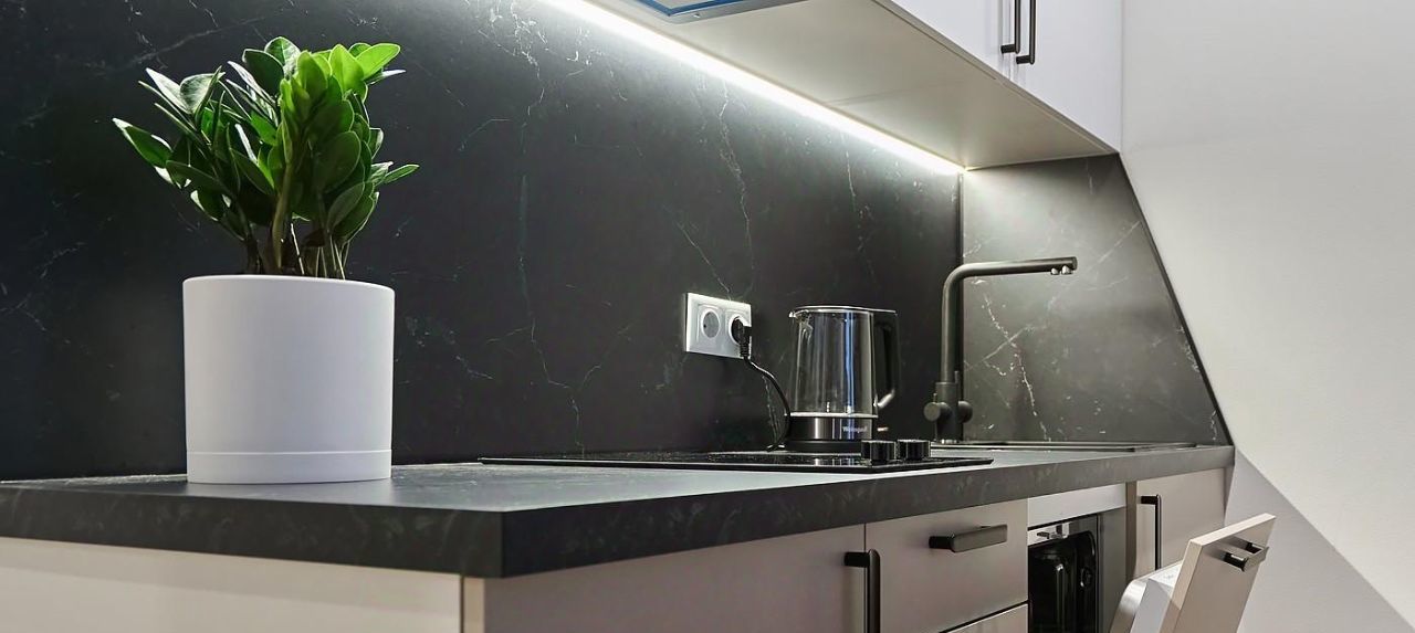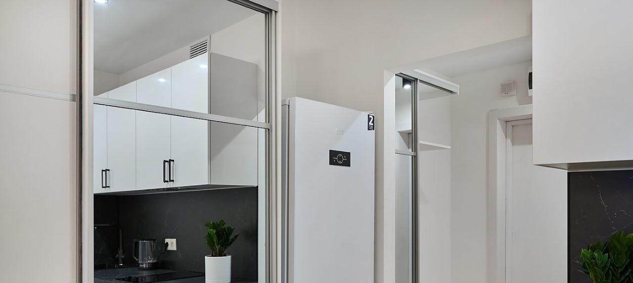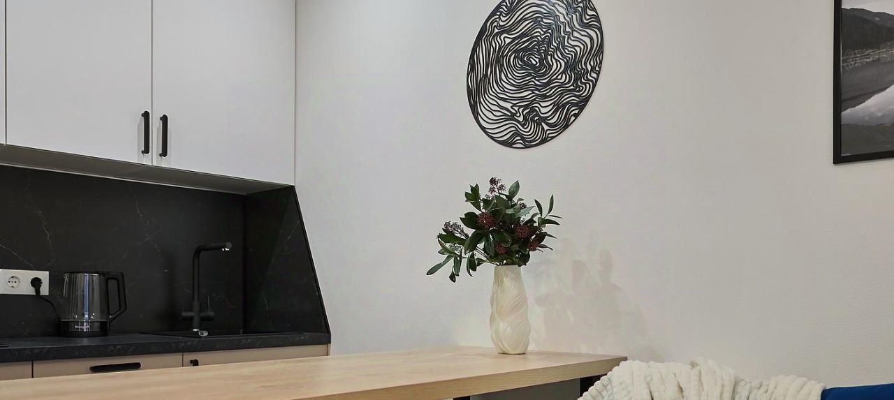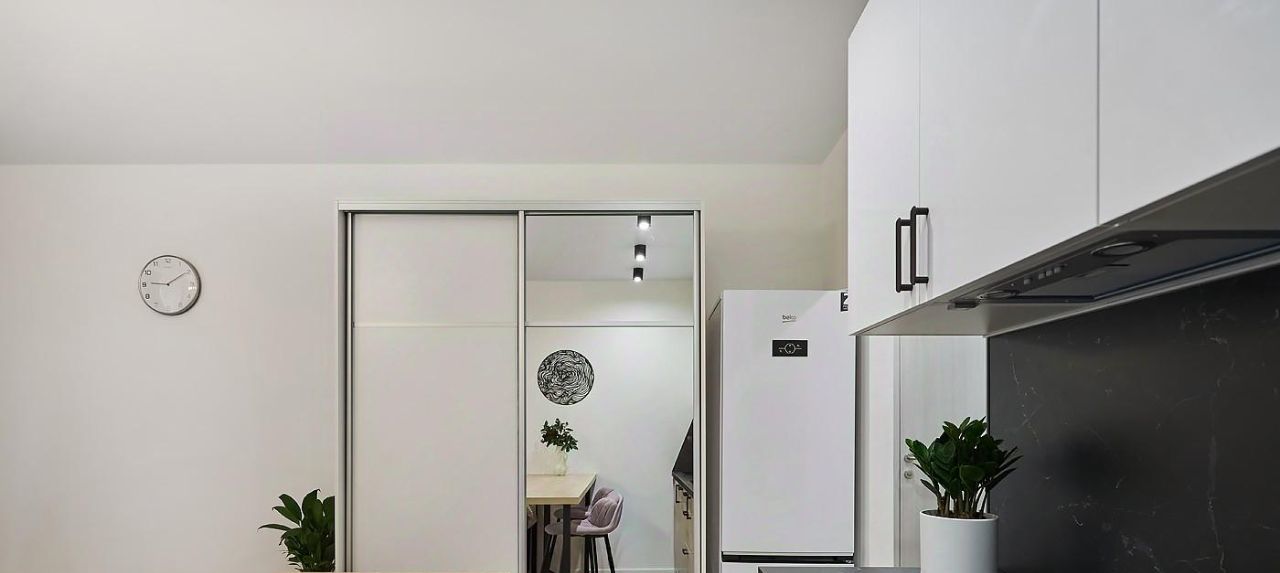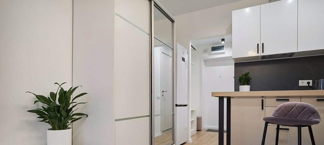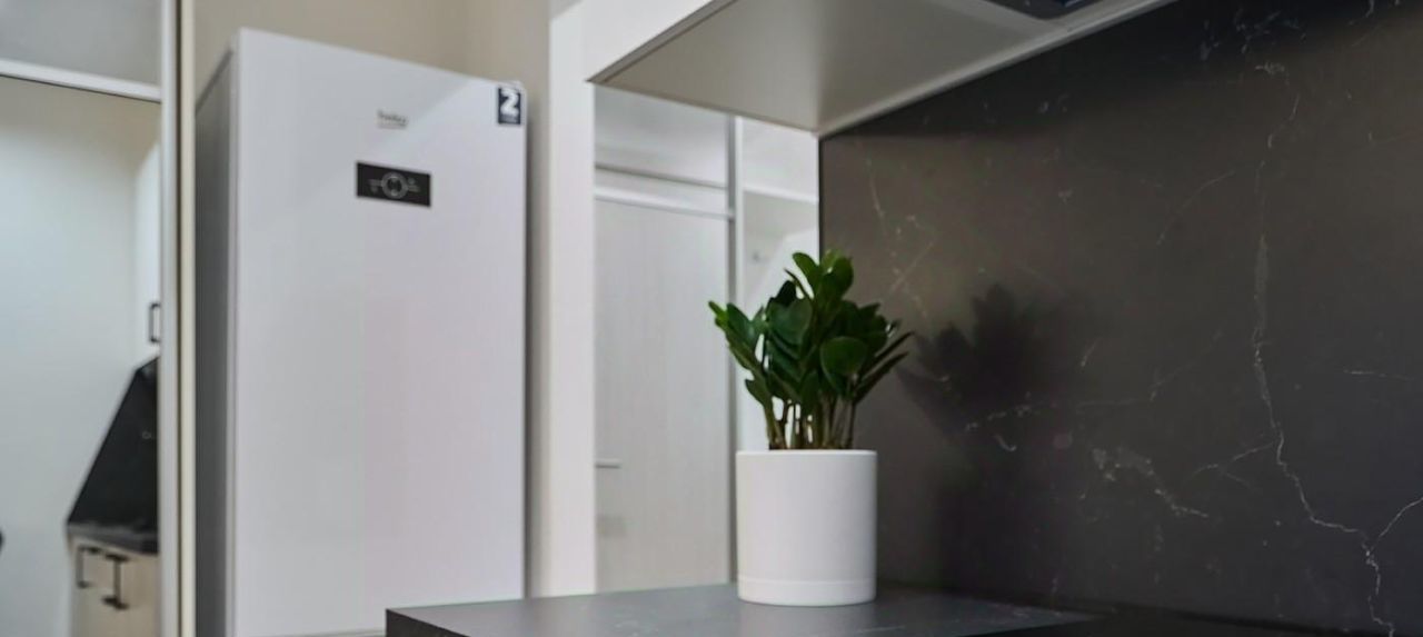 Техническое оснащение - в кухонной зоне установлена посудомоечная машина, фильтр питьевой воды варочная панель и вытяжка с угольным фильтром. Установлены Холодильник, стиральная машина. Велюровый диван с ящиком для хранения, при раскладывании образует спальное место шириной 140 сантиметров. Все растения не привередливые к поливу. Два зеркальных шкафа с местами под верхнюю одежду.