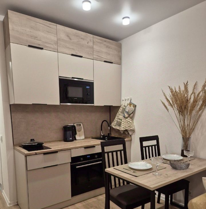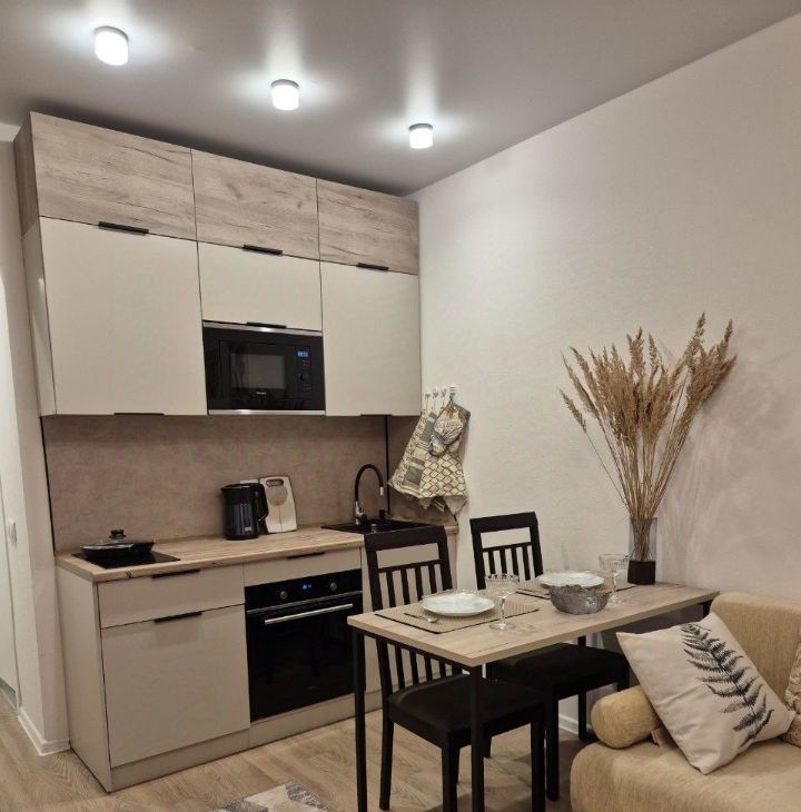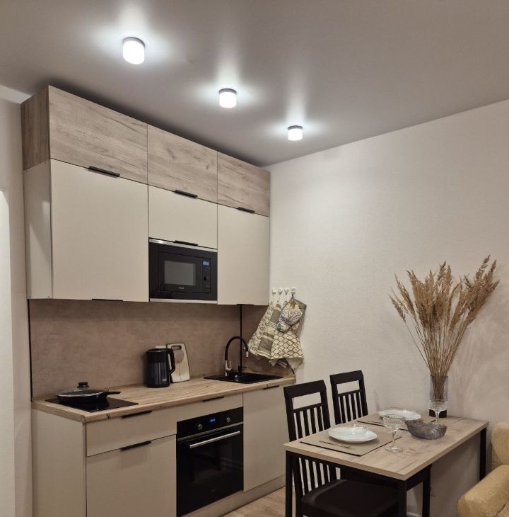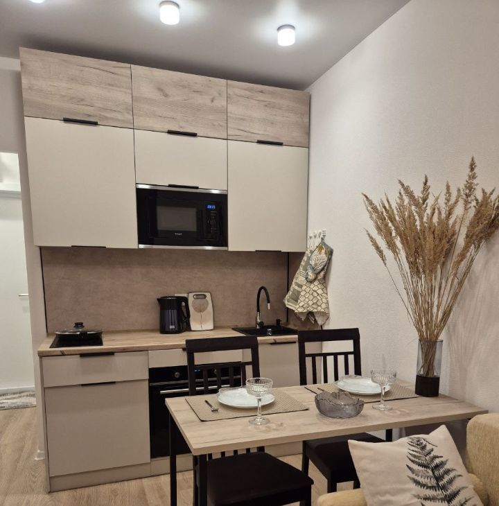 В квартире установлена вся необходимая для проживания мебель и техника. Встроенный кухонный гарнитур с варочной панелью, духовым шкафом, микроволновой печью, чайником.