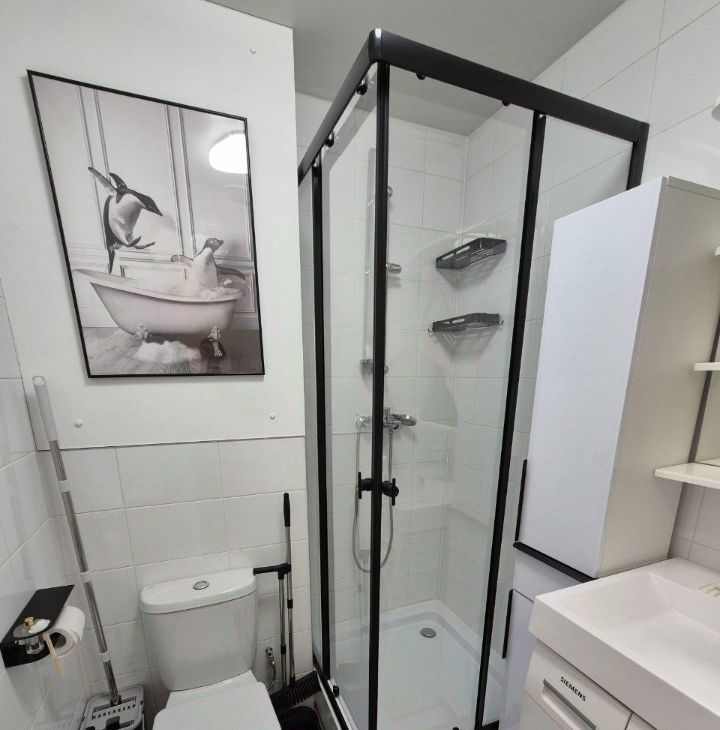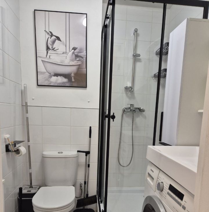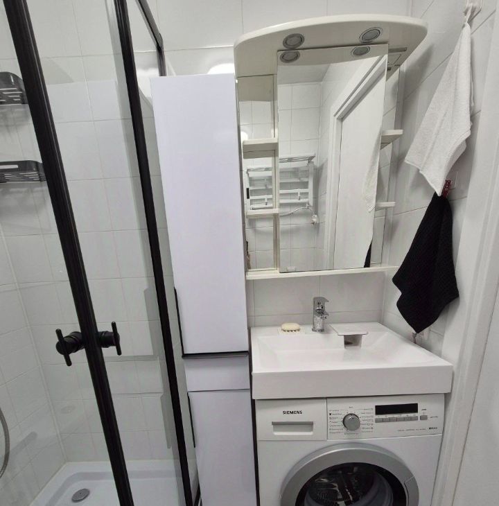 С/у совмещенный, в котором установлена стиральная машина-автомат.