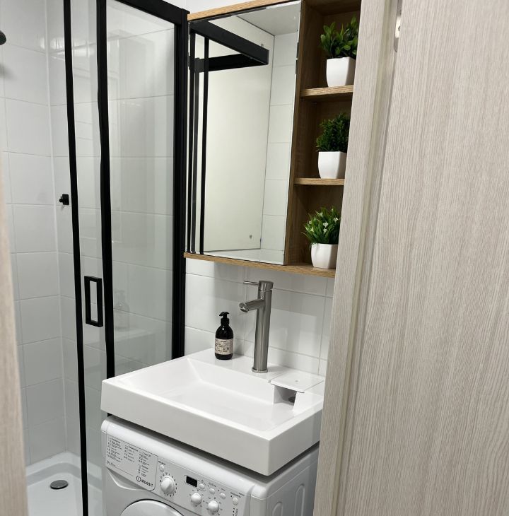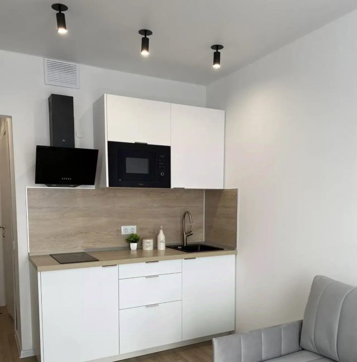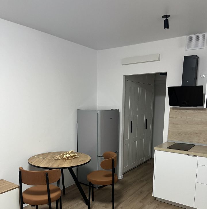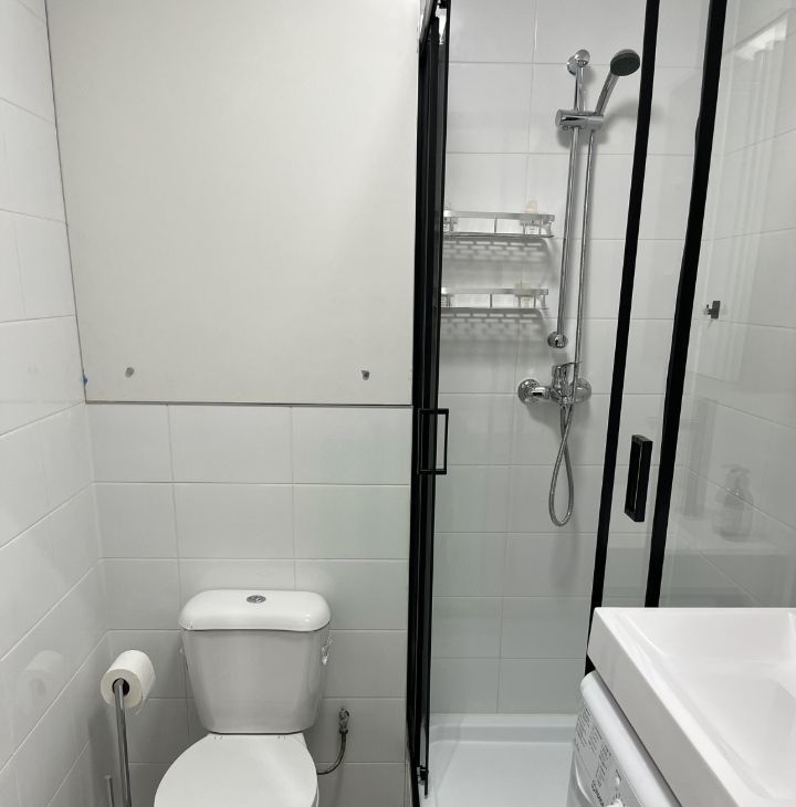Квартира с дизайнерским ремонтом, выполненным с использованием качественных материалов. Здесь есть все необходимое для комфортной жизни: кондиционер, холодильник, телевизор, стиральная машина. Пространство организовано максимально эффективно: компактная кухня, оборудованная мебелью и техникой, и зона отдыха в комнате. Санузел совмещенный, с душевой кабиной.