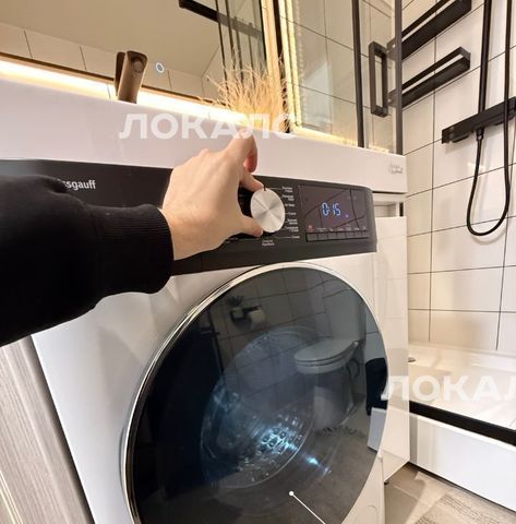 В ванной есть стиральная машинка с функцией сушки, большая раковина, душевая кабина, электрический полотенцесушитель.