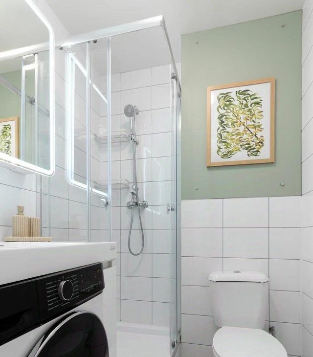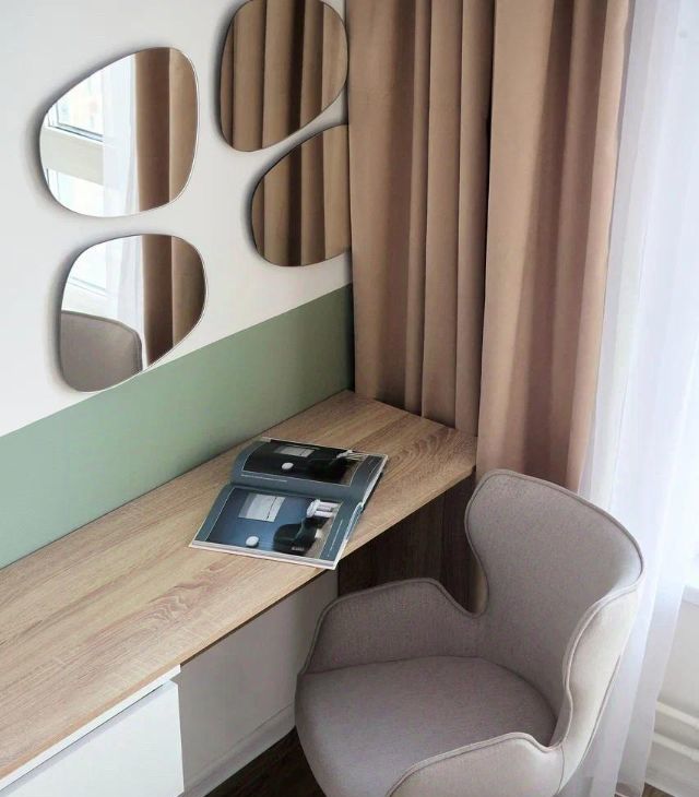 Есть крутые фишки в виде подсветки карниза и еще большого шкафа-зеркала в с/у для косметики).