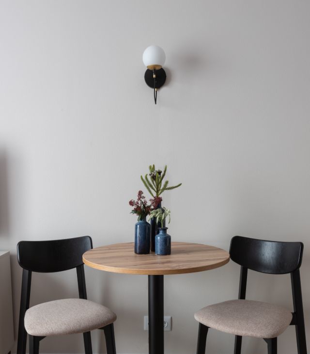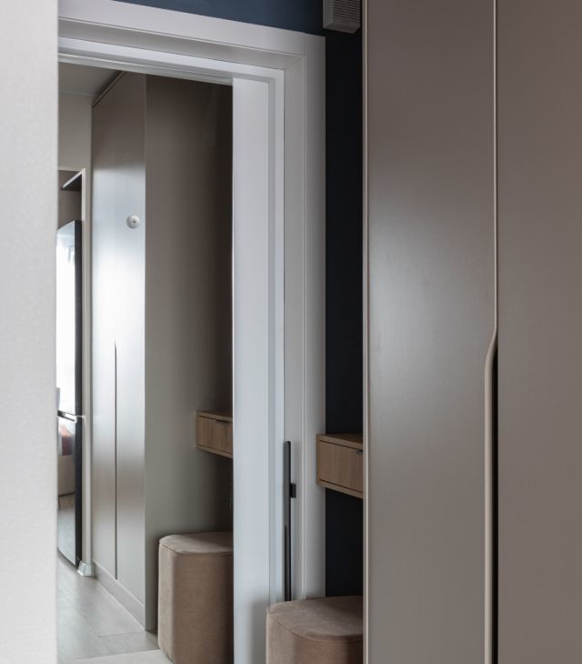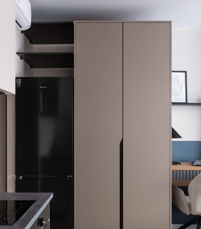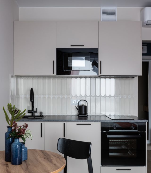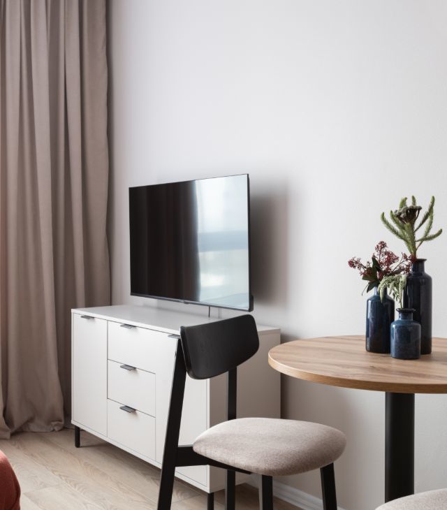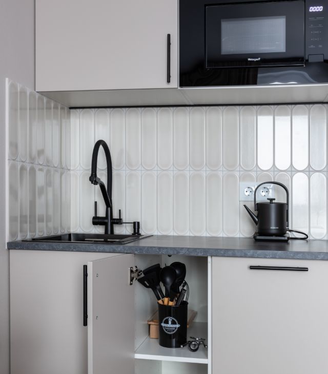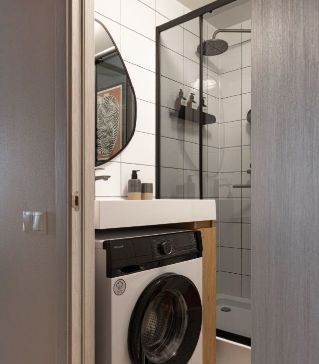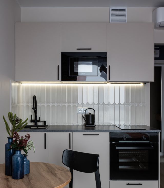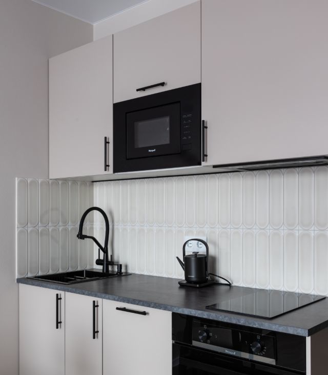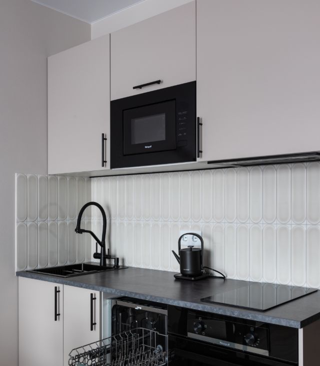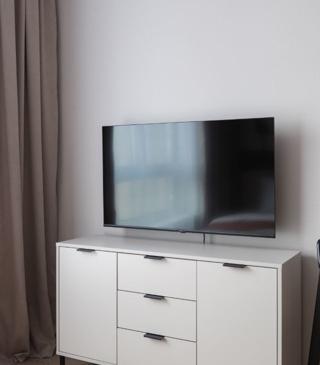 В квартире сделан дизайнерский ремонт, что придаёт ей особый уют и комфорт. Пространство студии максимально функционально: здесь есть всё необходимое для комфортной жизни. В комнате и на кухне установлена современная мебель, а из техники — кондиционер, холодильник, телевизор, посудомоечная и стиральная машины. В совмещённом санузле установлена душевая кабина.