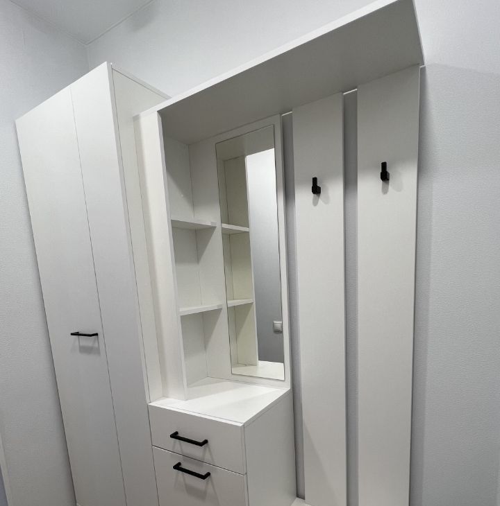 раскладной диван, стол, 2 стула, кухонный гарнитур, шкаф, тумба.