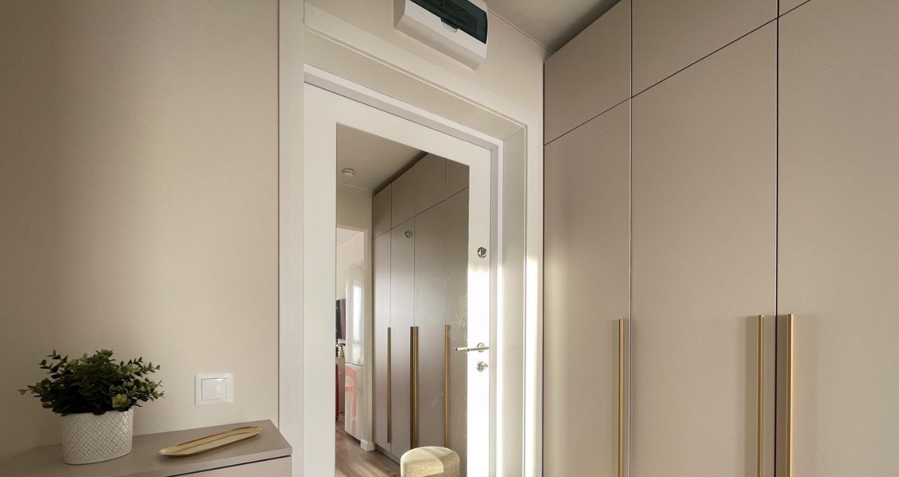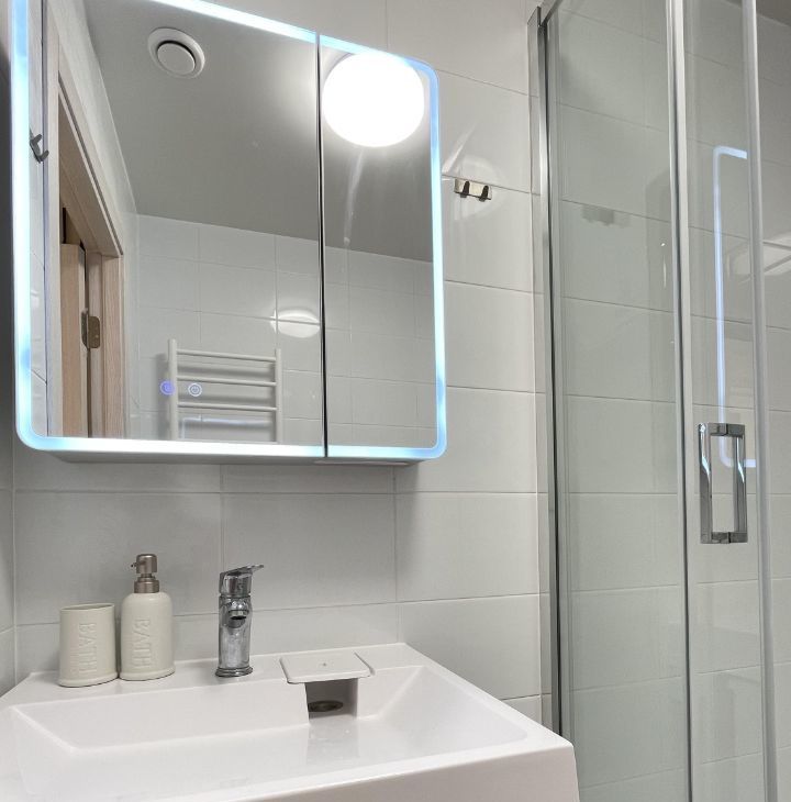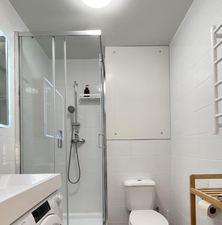 - Санузел: Душевая кабина, cтиральная машина с функцией сушки 2-в-1 — больше не нужно думать, где сушить белье. Дополнительно организованы места для хранения: зеркальный шкафчик и стеллаж со встроенной бельевой корзиной.