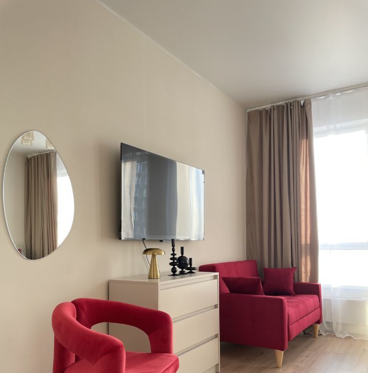- Гостиная зона: Раскладной диван, кресло, большой телевизор со Smart TV.