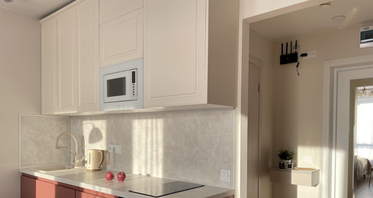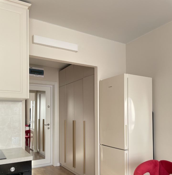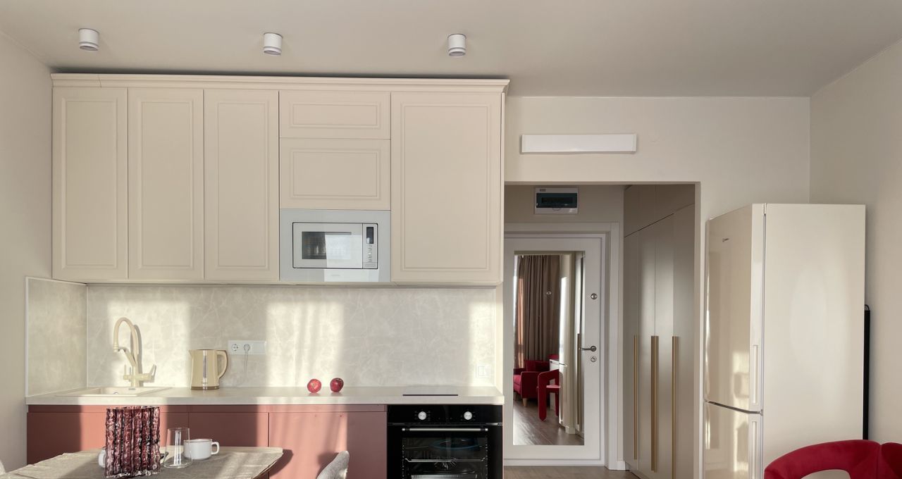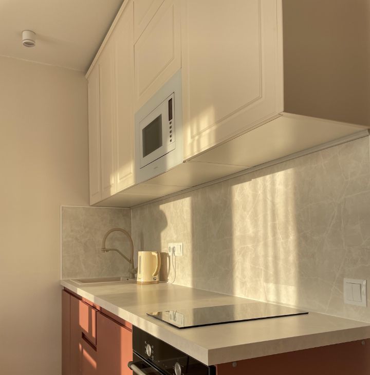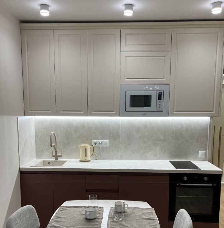 - Кухня: Большой холодильник, духовой шкаф, микроволновка, встроенный фильтр для чистой питьевой воды, индукционная варочная панель, чайник. Обеденная зона со столом и стульями, вся необходимая посуда.