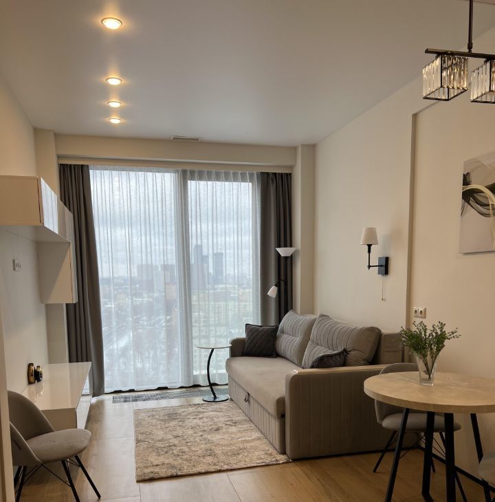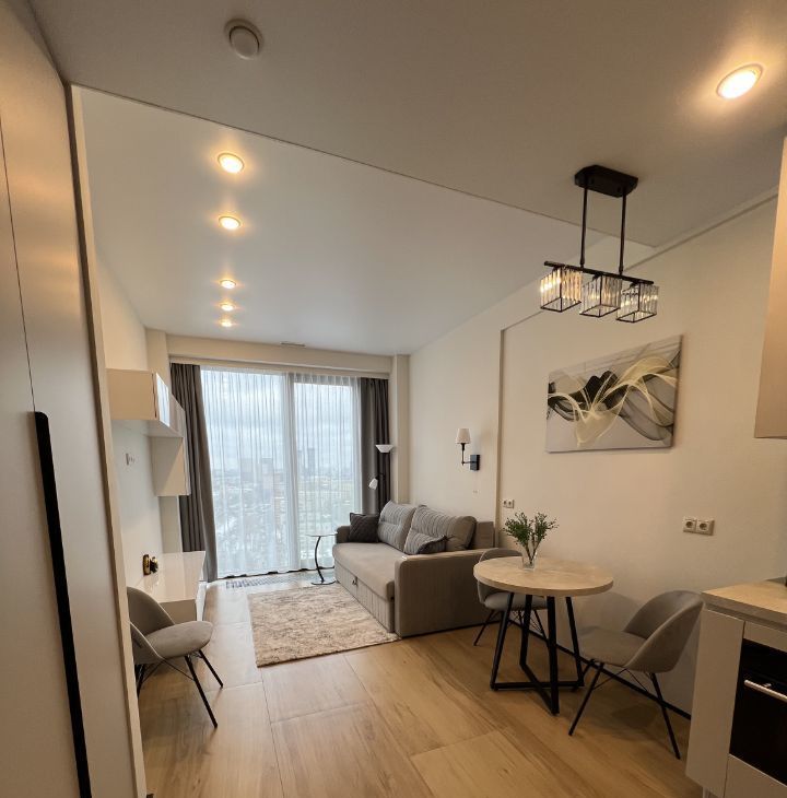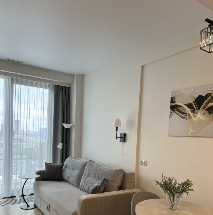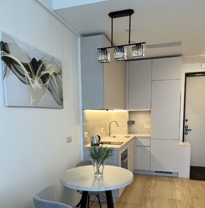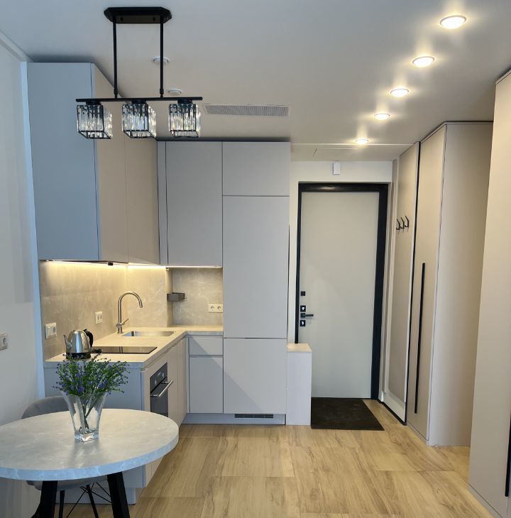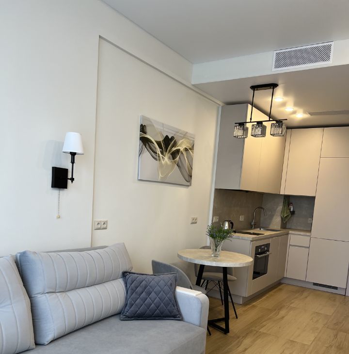 Студия полностью меблирована и оснащена всей необходимой техникой. В квартире есть кондиционер, холодильник, посудомоечная и стиральная машины, духовка и СВЧ. Кухня оборудована современными мебелью и техникой. Санузел совмещённый и оборудован душевой кабиной. Продуманные места хранения.
