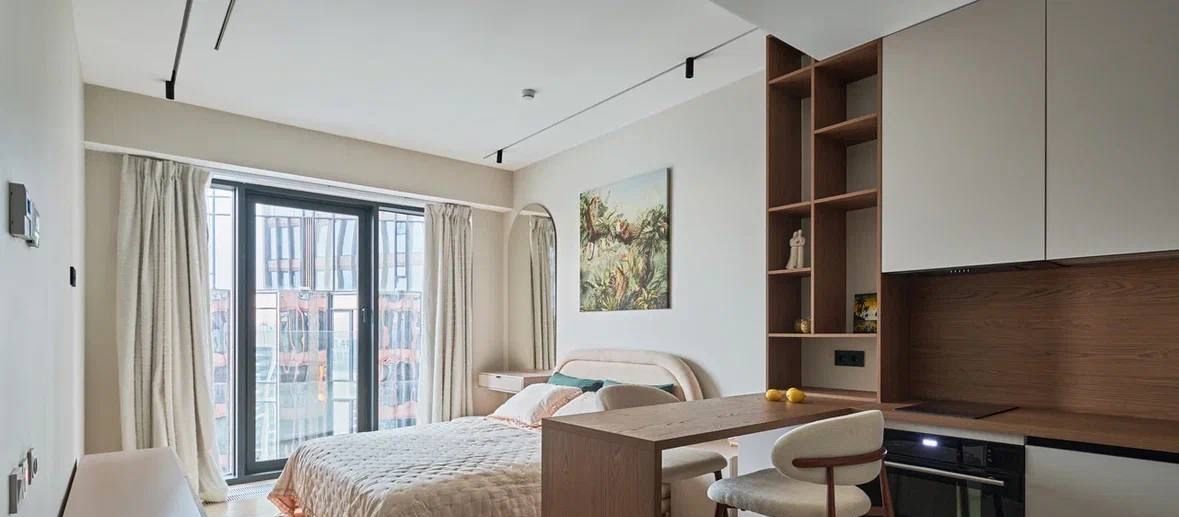 Сдаётся стильная студия в новом доме рядом с метро Дмитровская. Квартира находится на 31 этаже 54-этажного дома, построенного в 2024 году. Общая площадь — 27,5 кв. м, потолки высотой 3 метра. Окна выходят во двор, что обеспечивает тишину и спокойствие.