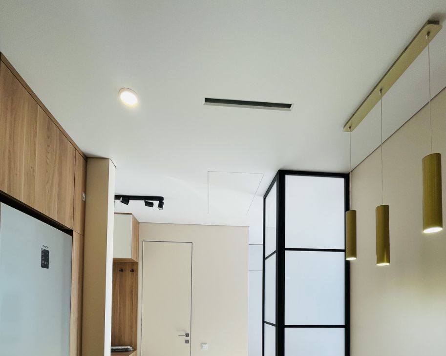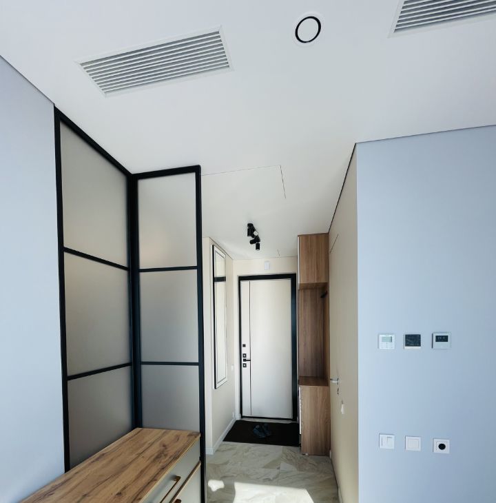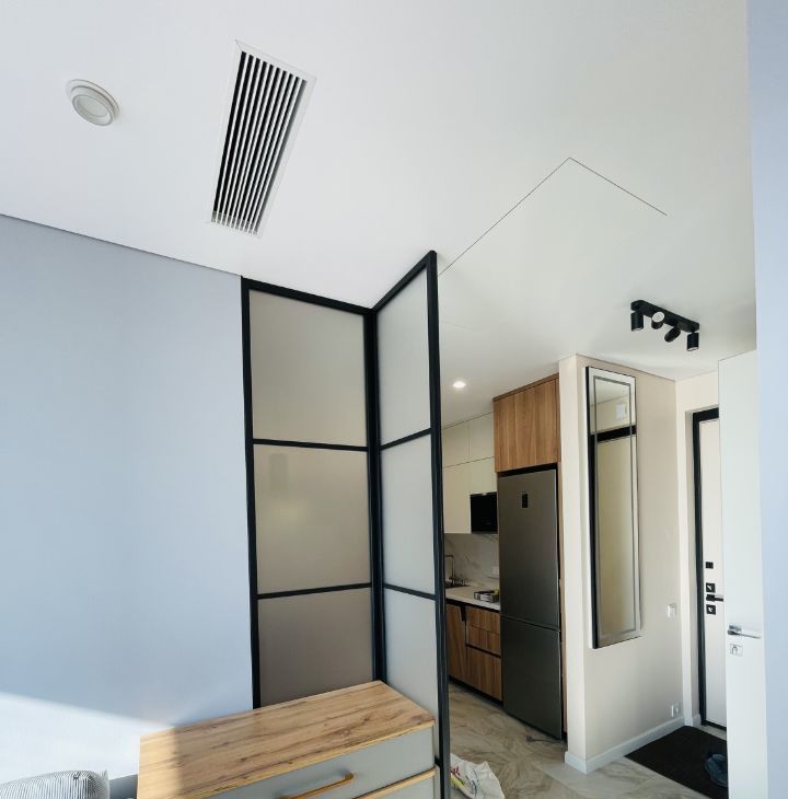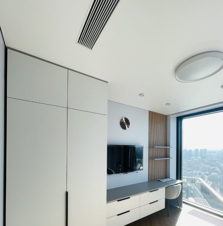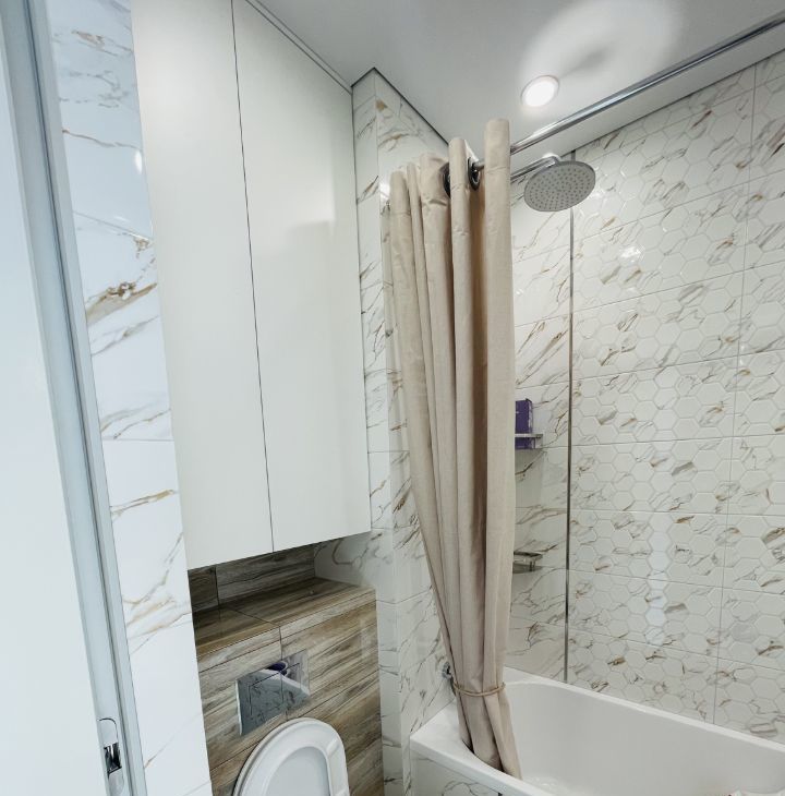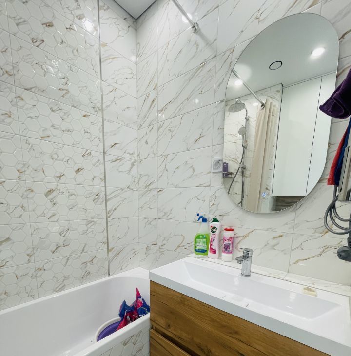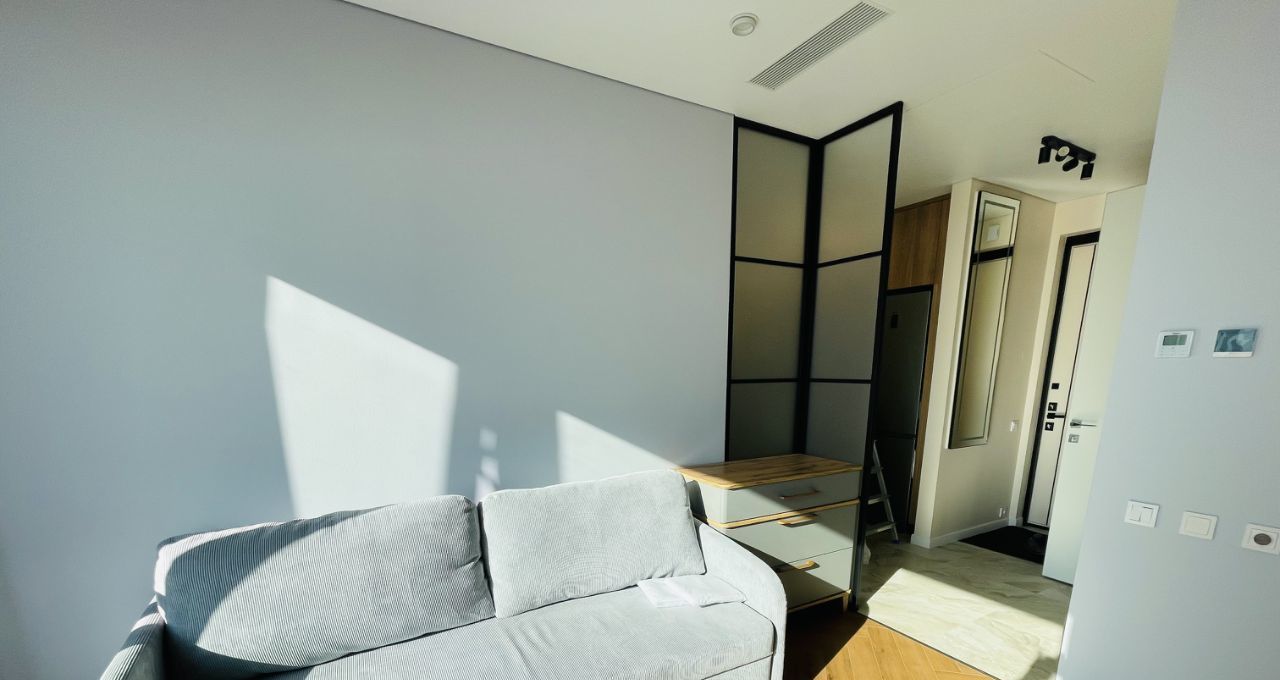 В квартире есть все необходимое для комфортного проживания: современная мебель в комнате и на кухне, а также полный комплект техники — кондиционер, холодильник, посудомоечная и стиральная машины, телевизор. Санузел совмещенный, оборудован ванной. Панорамные окна выходят на улицу, что обеспечивает естественное освещение и виды на город.