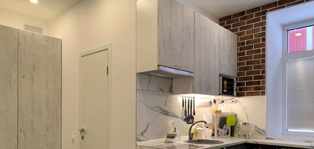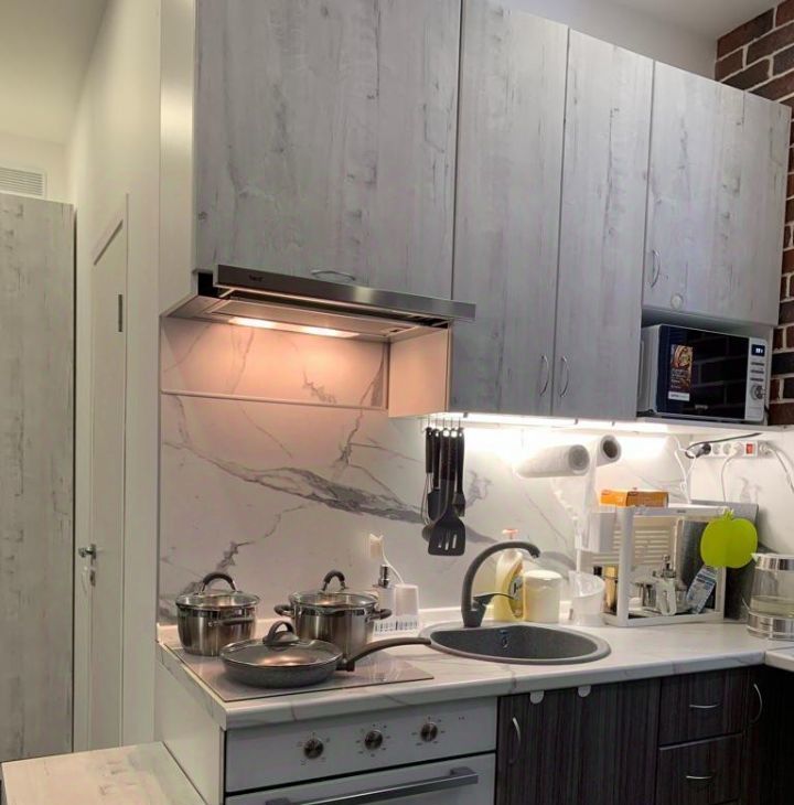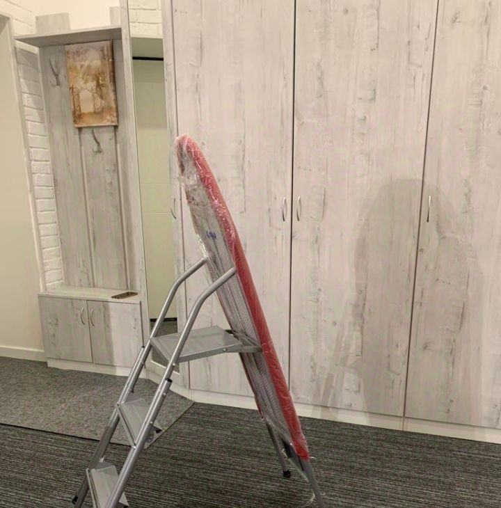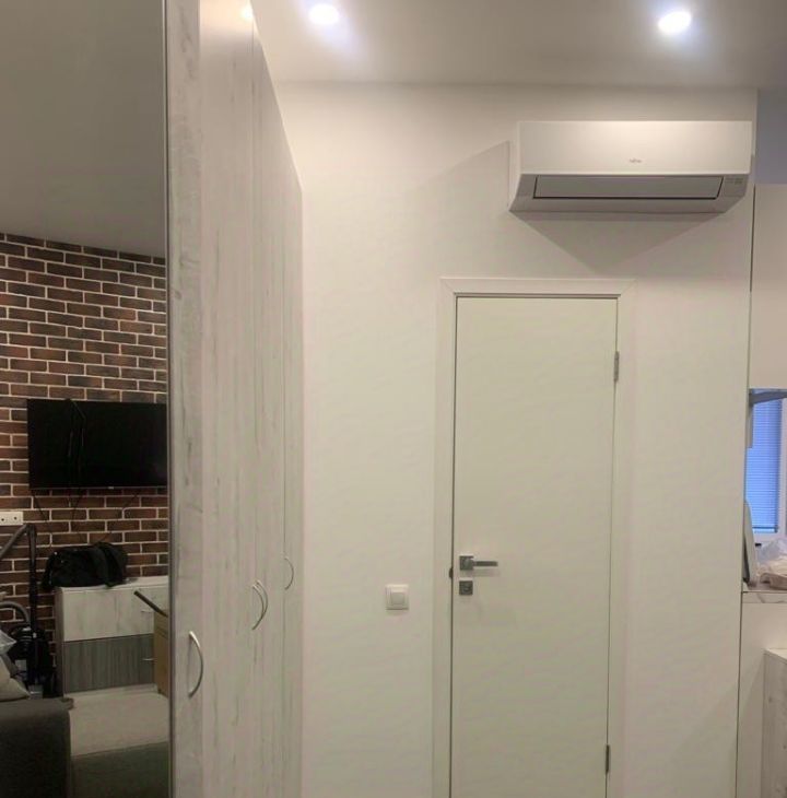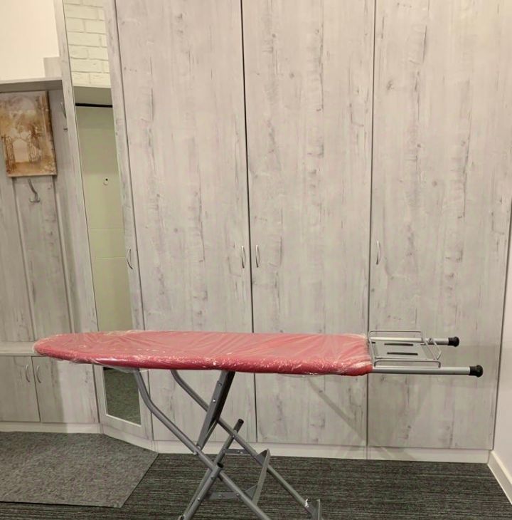 - Студия полностью обустроена и снабжена всем необходимым для жизни кроме п/м. На кухне полноразмерный холодильник с морозильной камерой, плита с духовым шкафом, много места для хранения. Имеется мелкая бытовая техника: телевизор (32 дюйма), микроволновка, чайник, утюг, пылесос. Есть посуда, сушилка для белья, гладильная доска со стремянкой, кондиционер;