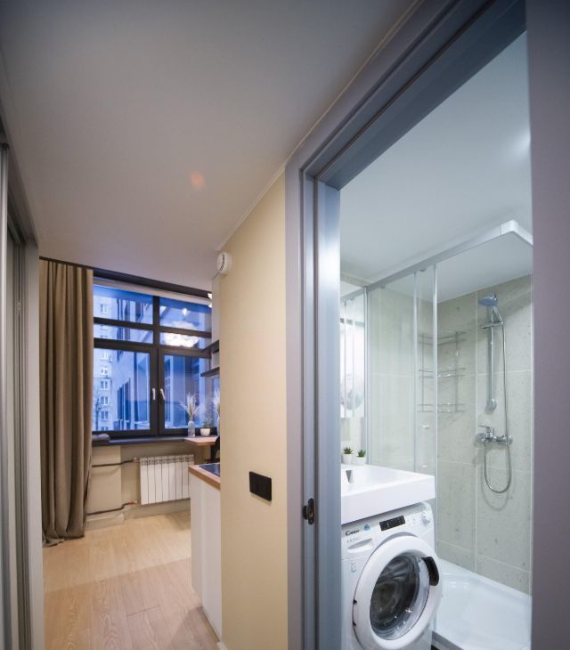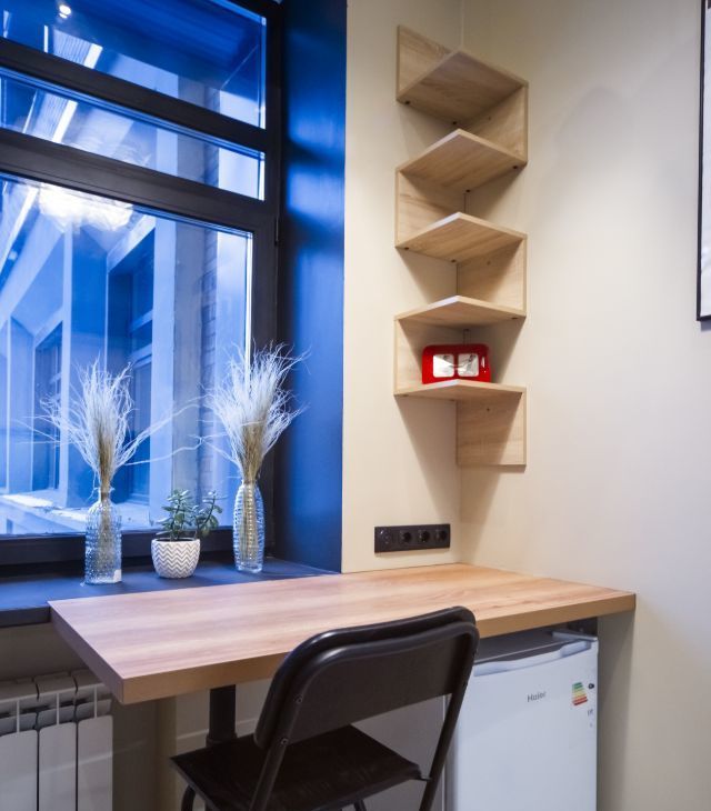 Продуманно все для длительного проживания - места хранения в прихожей и на втором уровне, под кроватью, вместительный стол для установки компьютера и обедов. Удобная кухня со всей необходимой техникой.