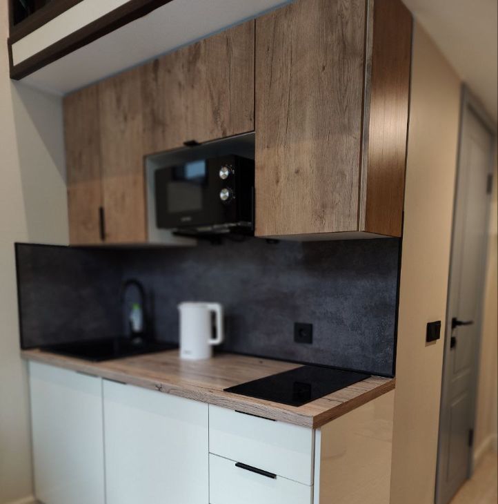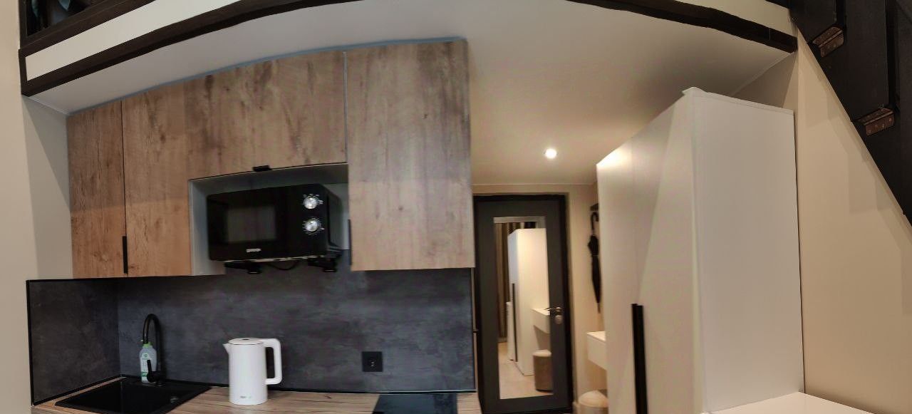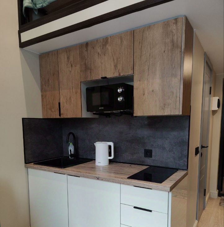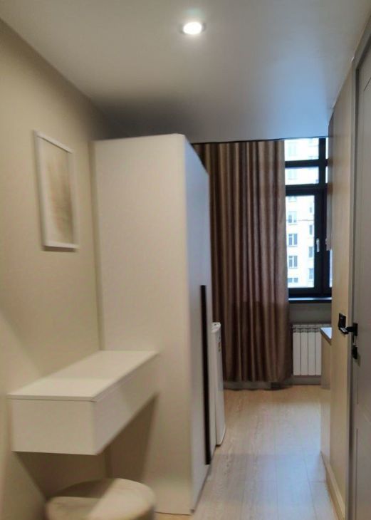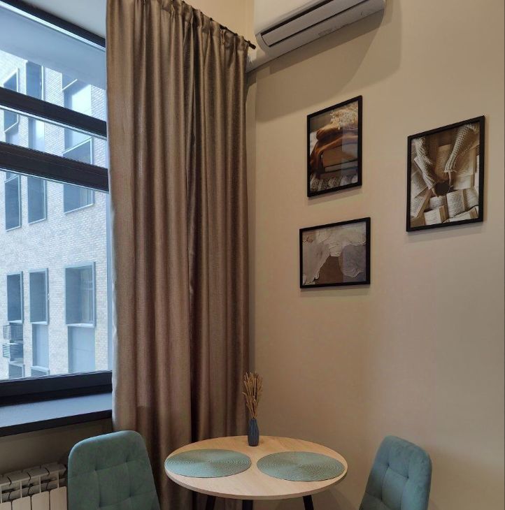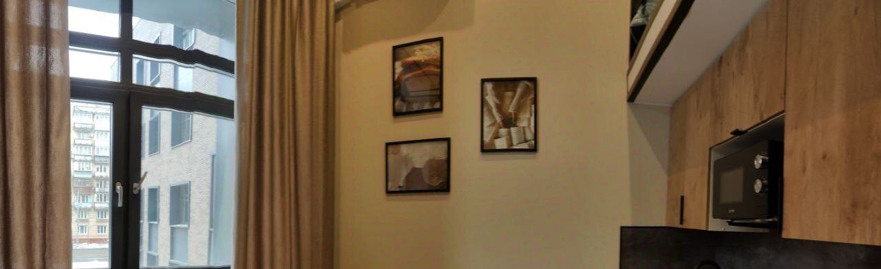 В студии есть вся необходимая мебель и техника (холодильник, слит-система, плита, стиральная машина, телевизор, чайник, утюг). Окна выходят на тихую улицу с деревьями под окном.