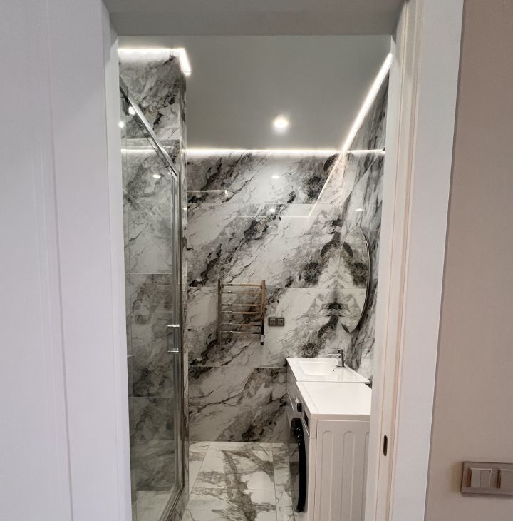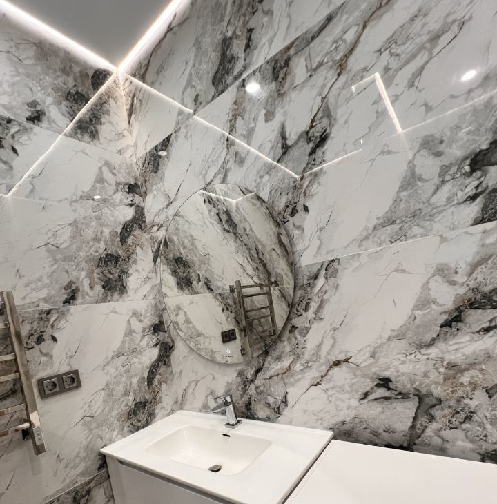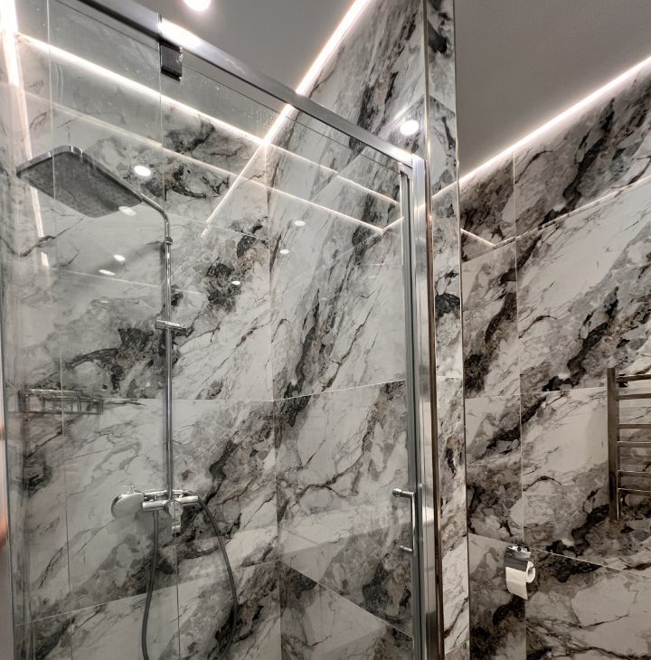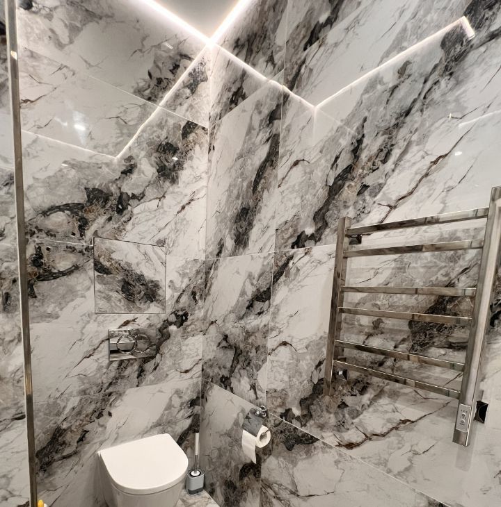 Совмещённый санузел оформлен в современном стиле с использованием качественных материалов.