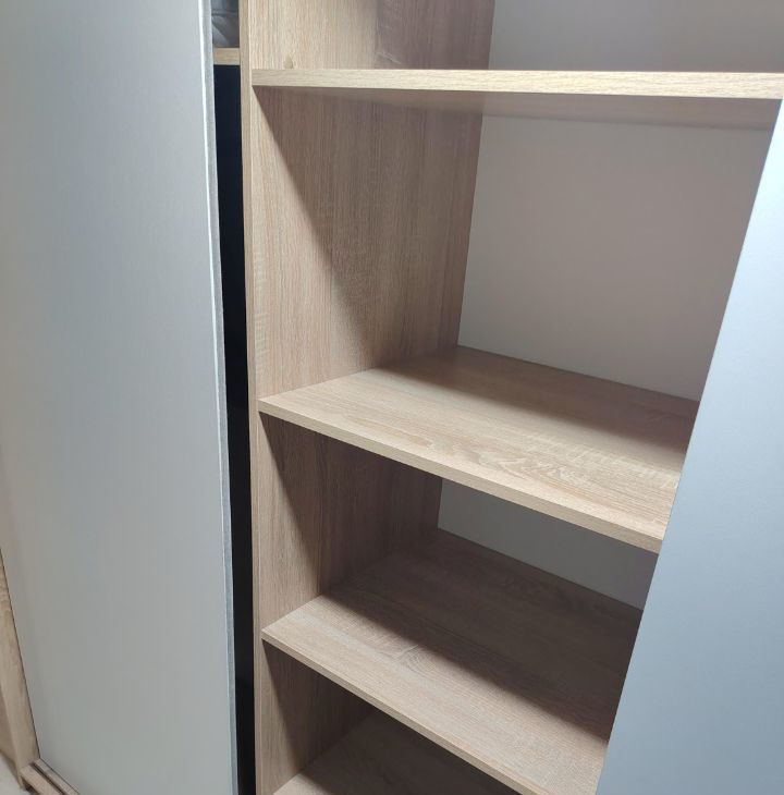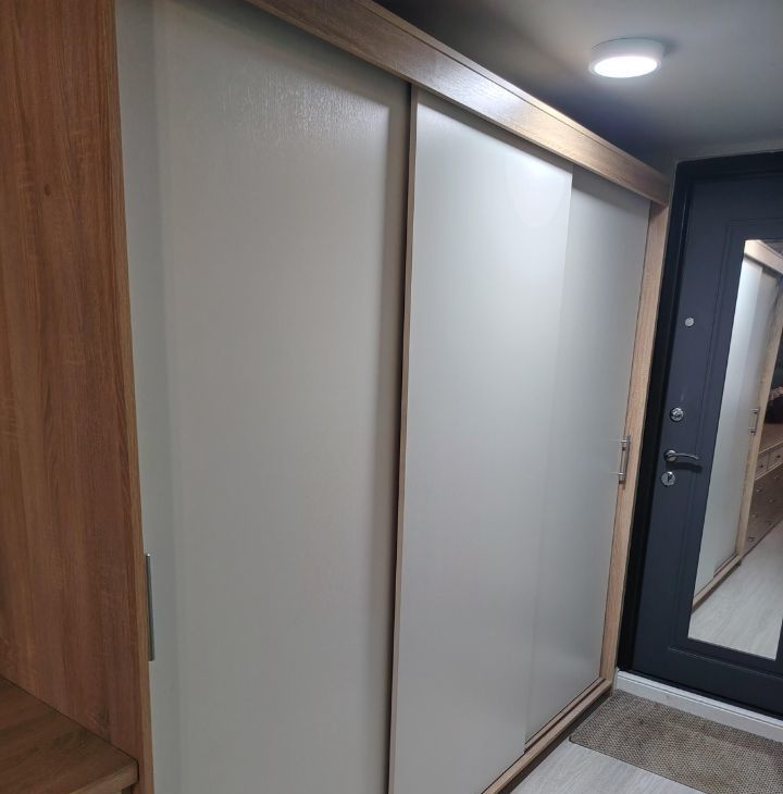Есть спальное место, холодильник, чайник, плита, стиралка, очень просторный вместительный шкаф, антресоль наверху.