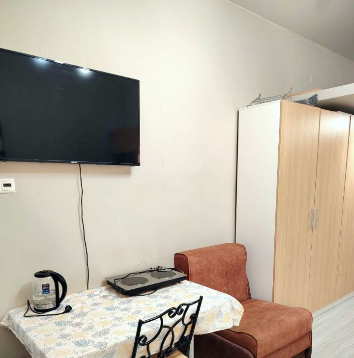 Есть спальное место, холодильник, чайник, плита, стиралка, ТВ, просторный вместительный шкаф.