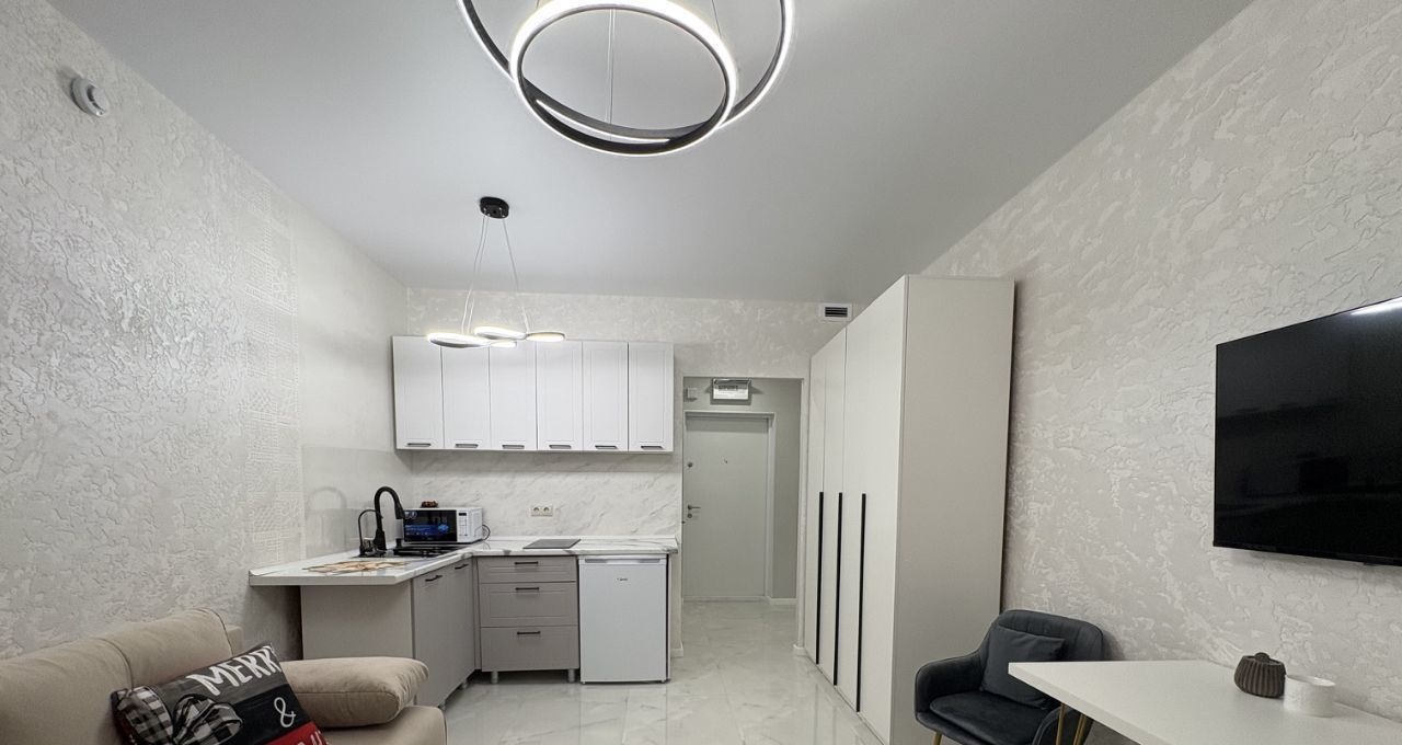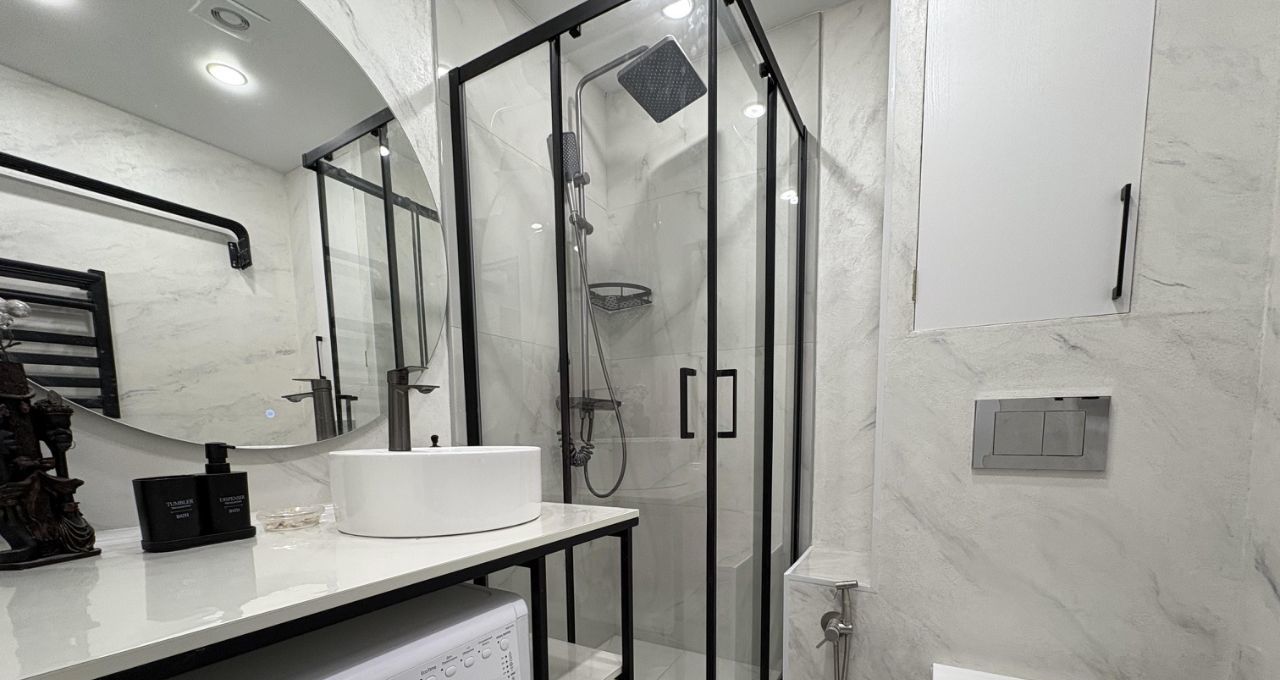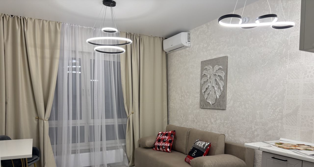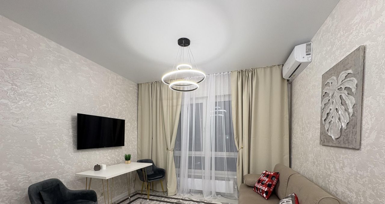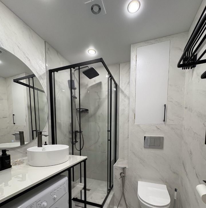 В квартире есть все необходимое для комфортного проживания. Пространство организовано с учетом современных тенденций: совмещенный санузел оборудован душевой кабиной, а кухня и комната укомплектованы мебелью. Из техники в вашем распоряжении кондиционер, холодильник, телевизор и стиральная машина.