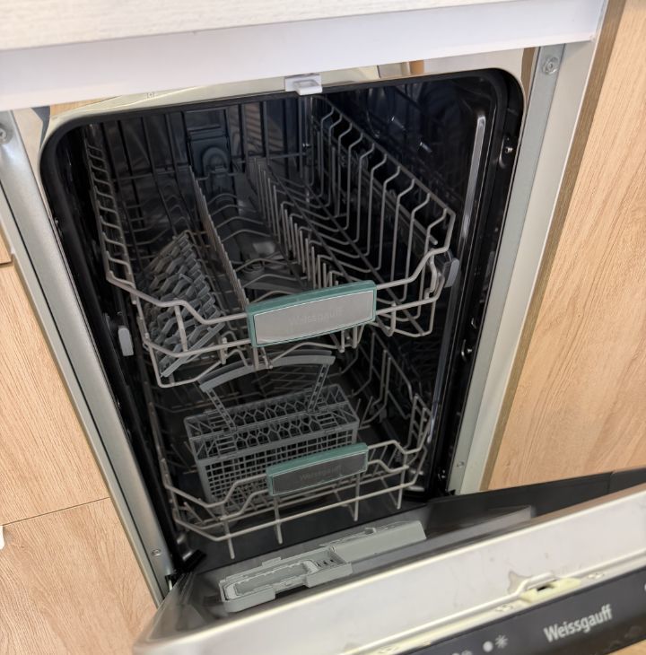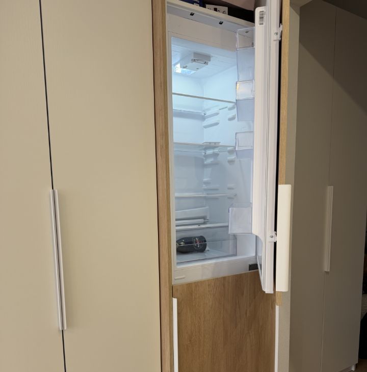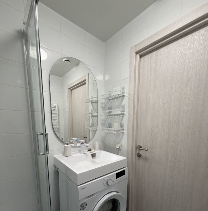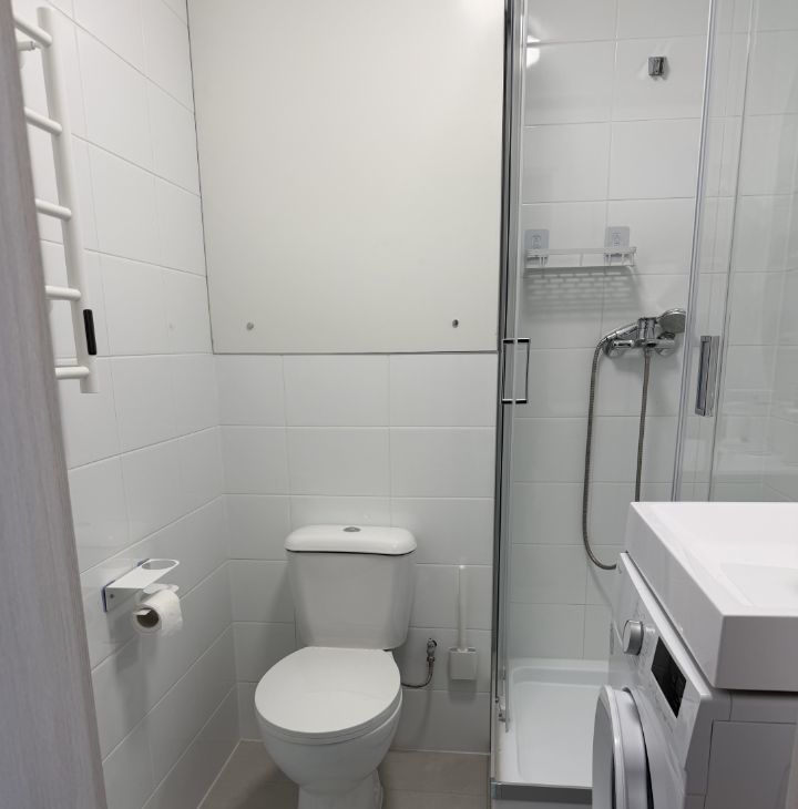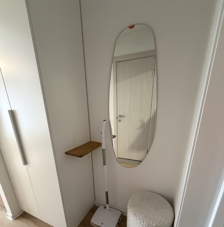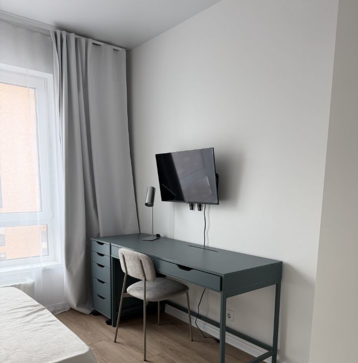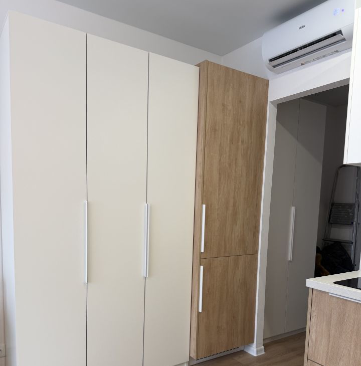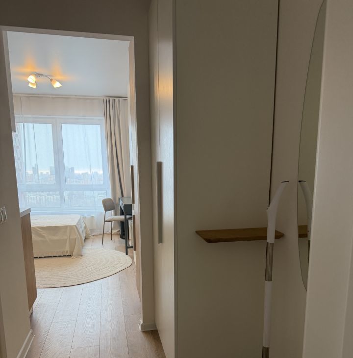 В квартире кровать 140 см, рабочий стол, встроенный холодильник, телевизор, посудомоечная и стиральная машины, элетрошвабра, вытяжка, микроволновка, большой шкаф в комнате и шкаф в коридоре