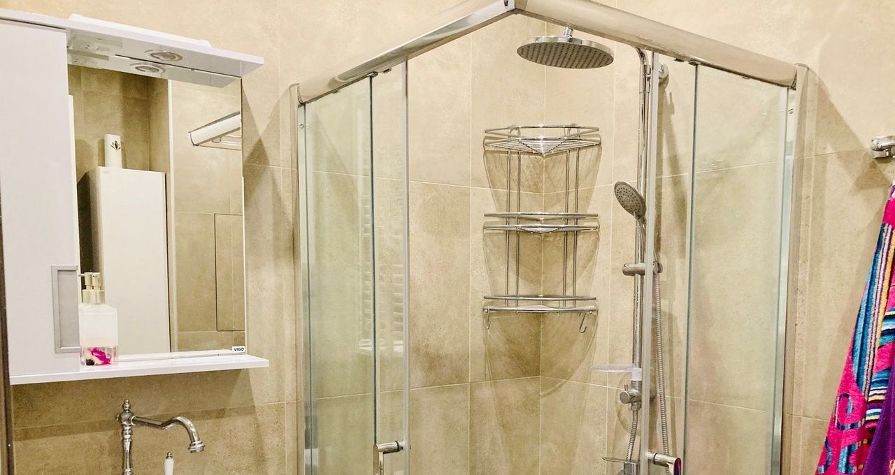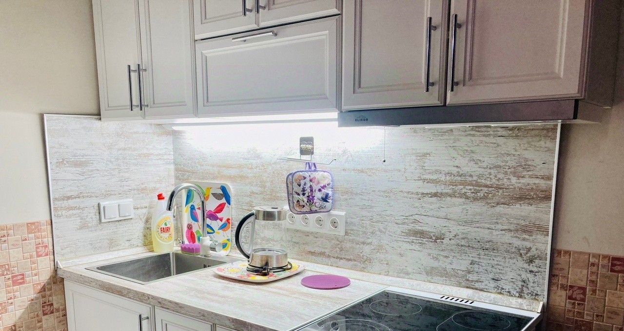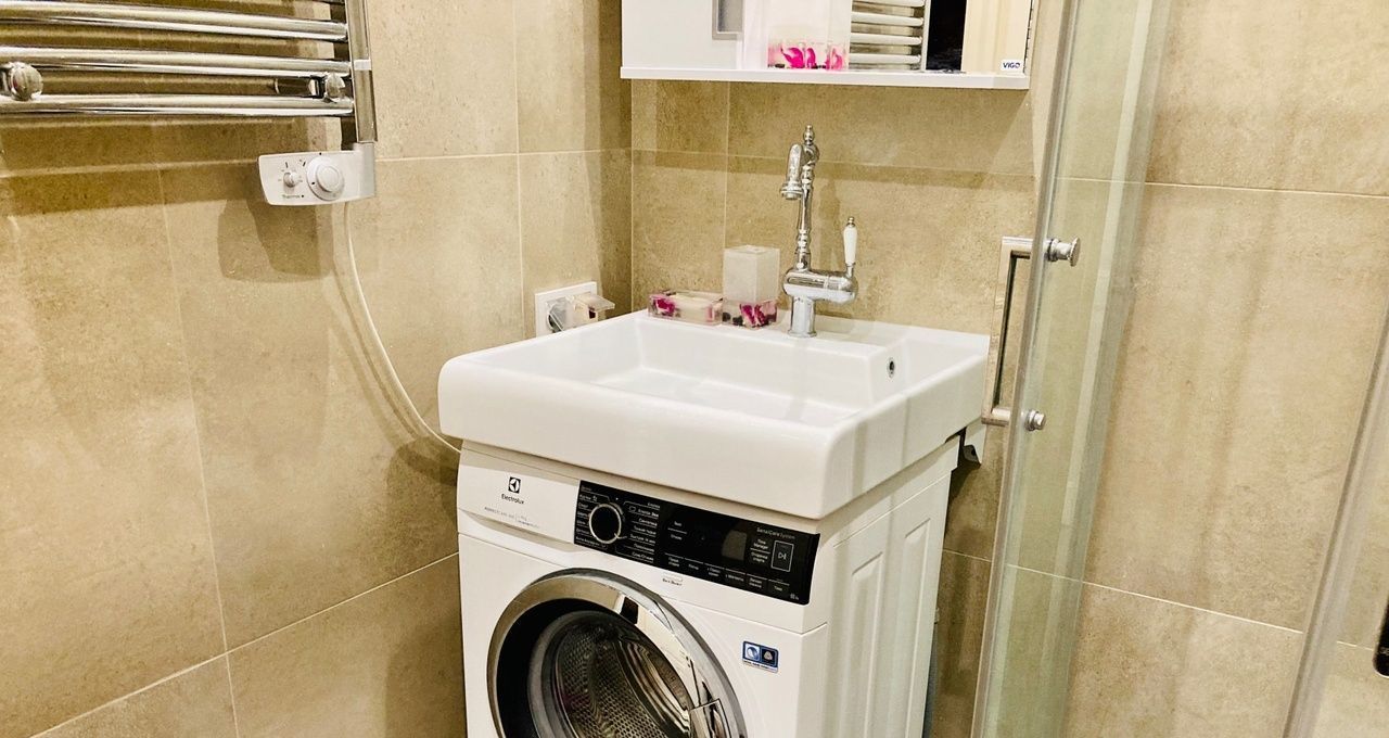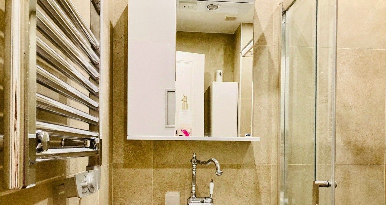 В студии есть ортопедический диван-кровать, телевизор, два шкафа, один из которых с подсветкой, большой обеденный стол. В кухонной зоне установлен холодильник, духовой шкаф, встроенная индукционная плита и фильтр для воды, вся необходимая посуда. Ванная комната с дополнительным местом для хранения, стиральной машиной, тропическим душем и электрическим полотенце-сушителем.
