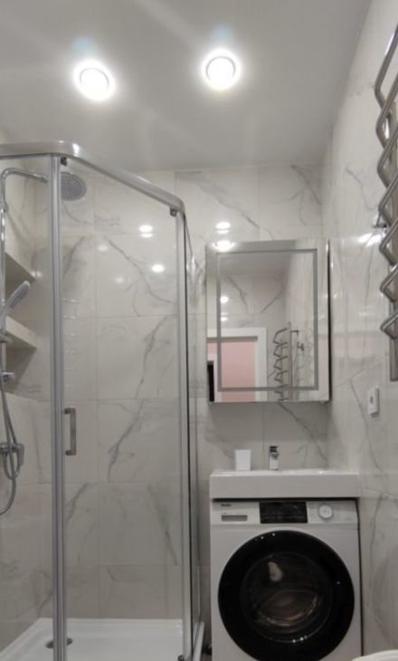 На кухне холодильник, микроволновка, электрочайник, вытяжка, варочная панель, набор посуды. Санузел совмещённый, отделан мраморным керамогранитом. В санузле есть: шкаф со светодиодной подсветкой, душевая кабина, электрический полотенцесушитель с регулировкой мощности, сантехника немецких брендов GROE и Wassercraft, стиральная машина Haier c функцией стрики паром. Установлена система от протечки воды Нептун.