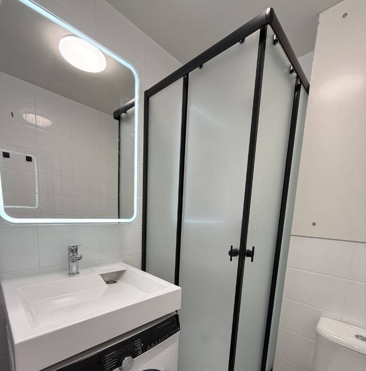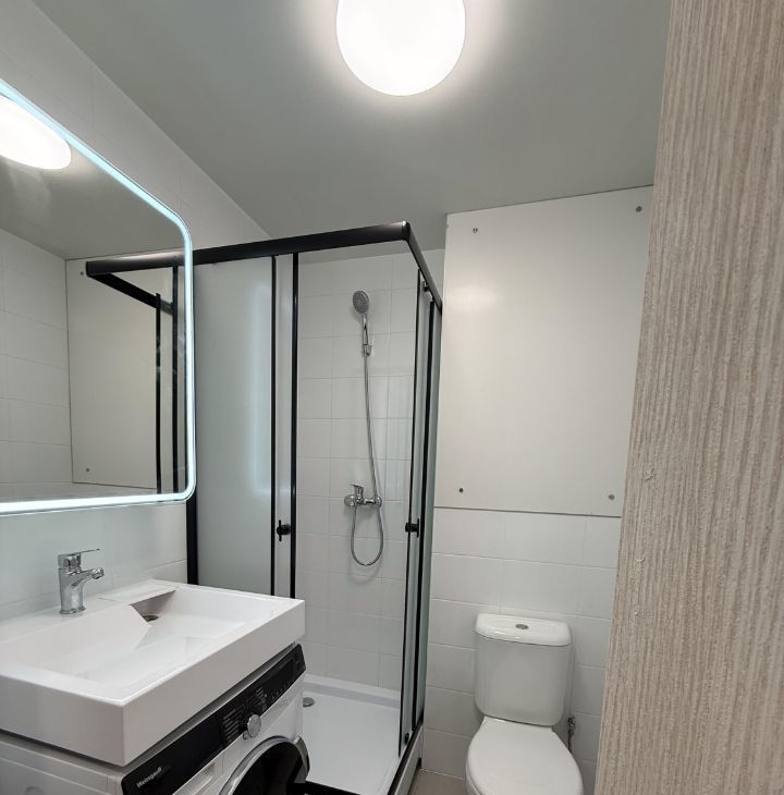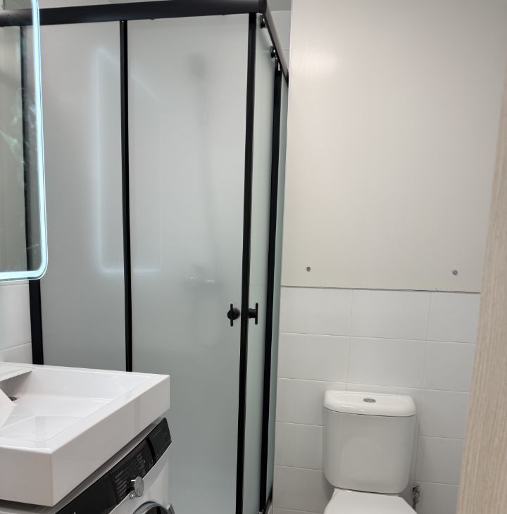 Ванная комната совмещенная, оборудована душевой кабиной и стиральной машиной..