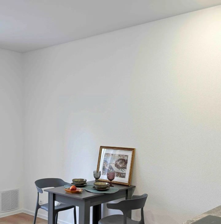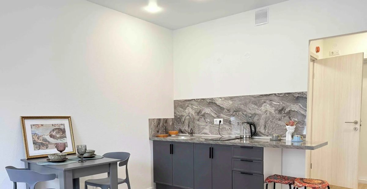 Студия выполнена в стиле "евроремонт" и полностью готова к проживанию. В комнате есть вся необходимая мебель, включая удобную кровать и шкаф для хранения вещей. Окна выходят во двор, поэтому в квартире всегда тихо и спокойно.