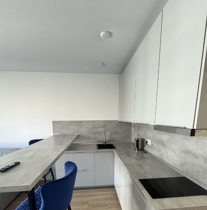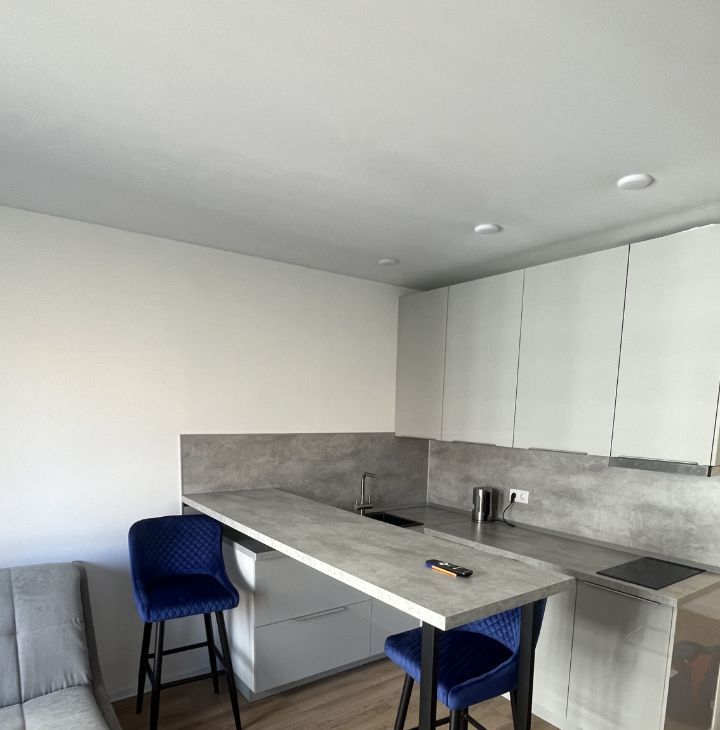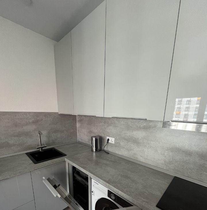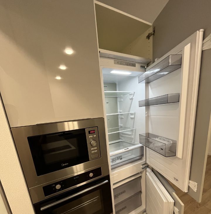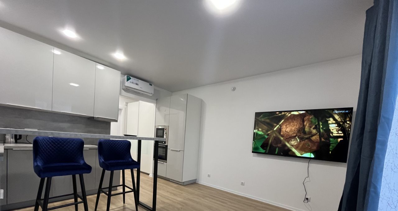 Светлая , чистая, красивая студия, укомплектована всей необходимой мебелью и бытовой техникой: один 2-х спальный диван, шкаф-купе, телевизор 65 диагональ, встроенный холодильник, встроенная стиральная машина, встроенная посудомоечная машина, встроенный духовой шкаф, индукционная плита, встроенная микроволновая печь, чайник и др., есть все для комфортного проживания.