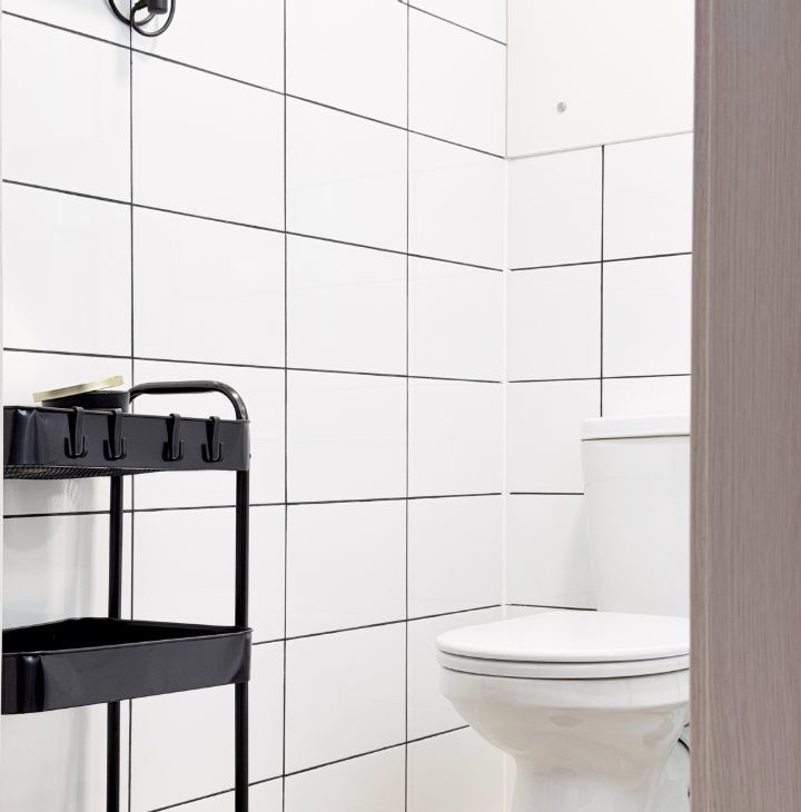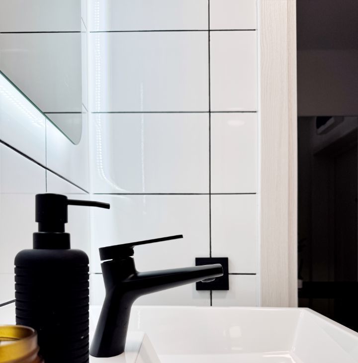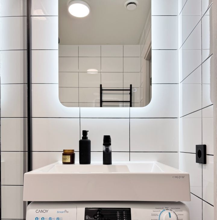 - Светлая ванная комната с современной сантехникой.