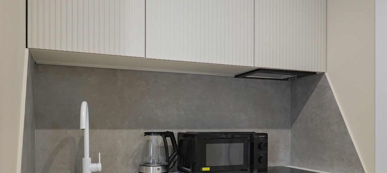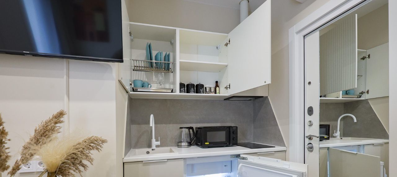 — плита, вытяжка, микроволновая печь, холодильник, чайник;