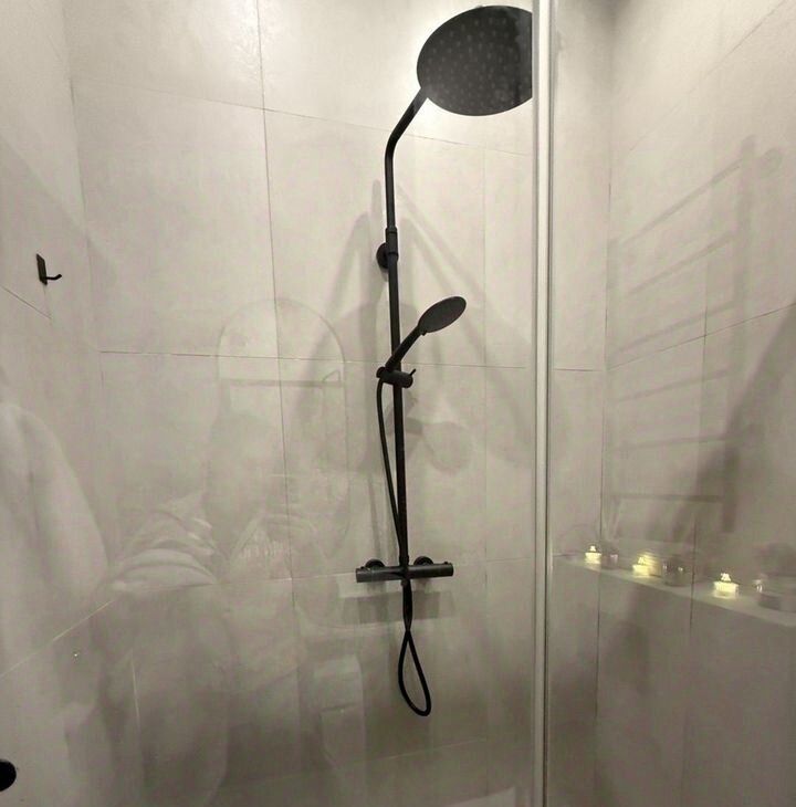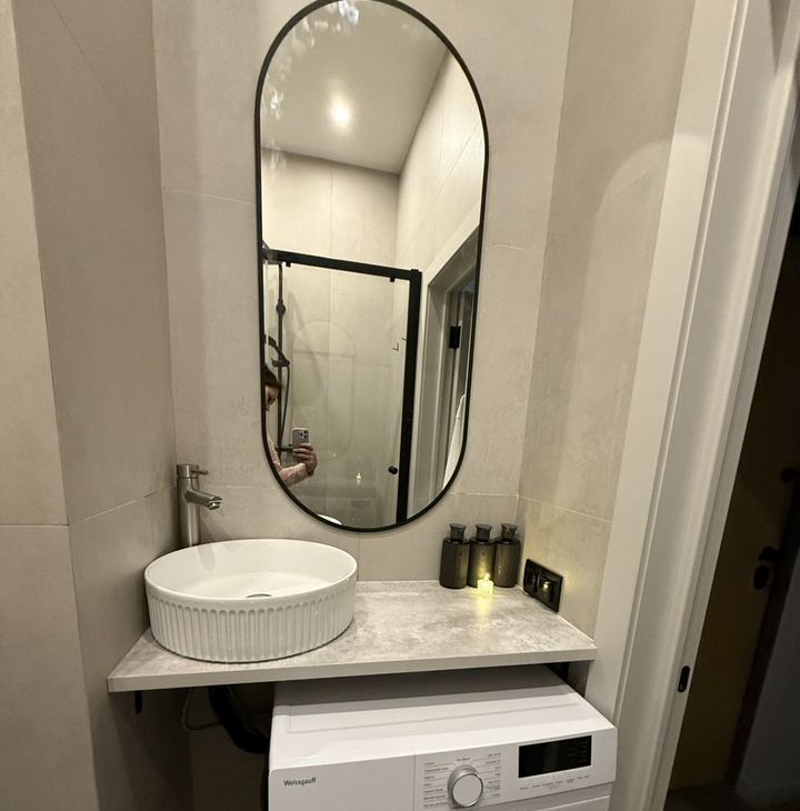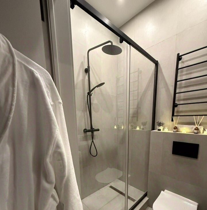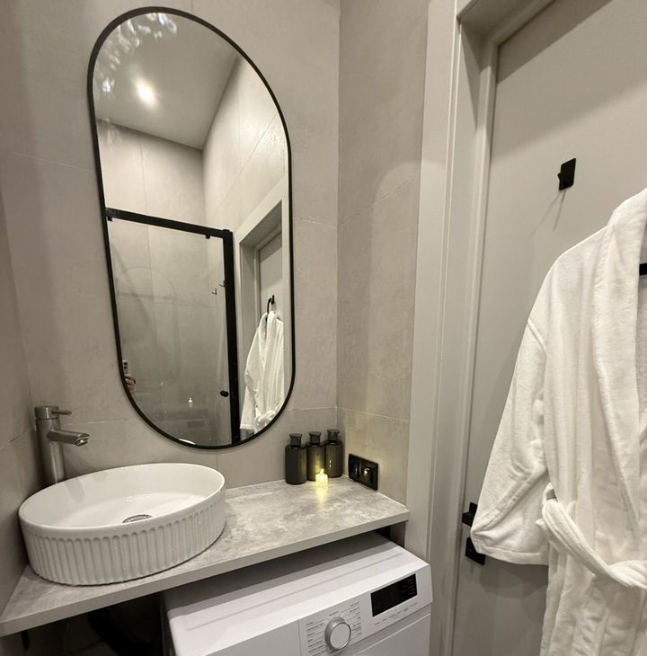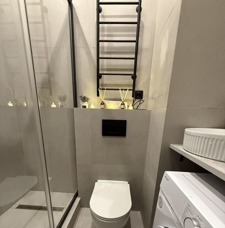 В ванной душевая с стеклянной перегородкой, мощная стиральная машина на 6 кг с функцией стирки паром.