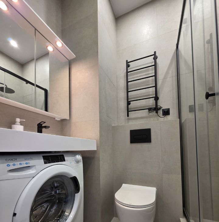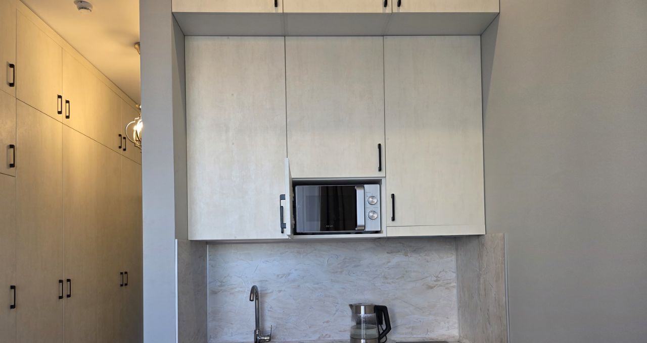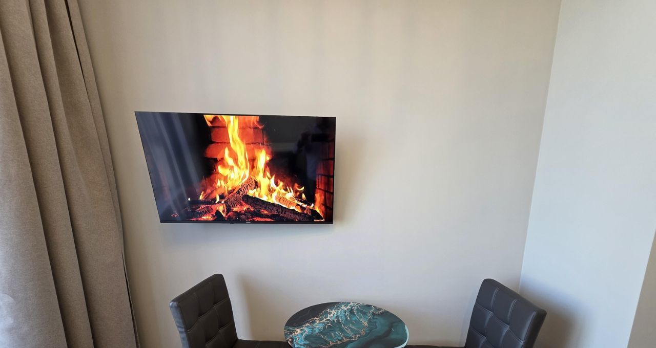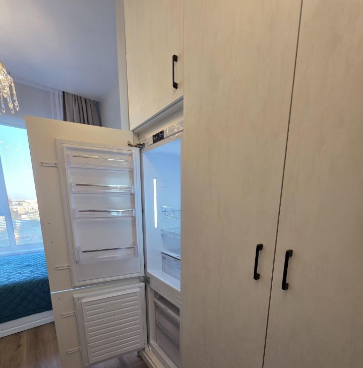 Холодильник, большой телевизор 43 дюйма 4К, микроволновка, чайник, индукционная плита, стиральная машина, утюг, гладильная доска, стремянка.