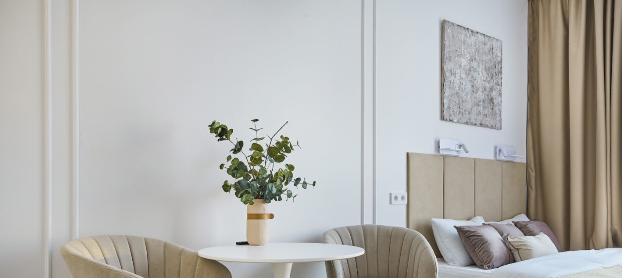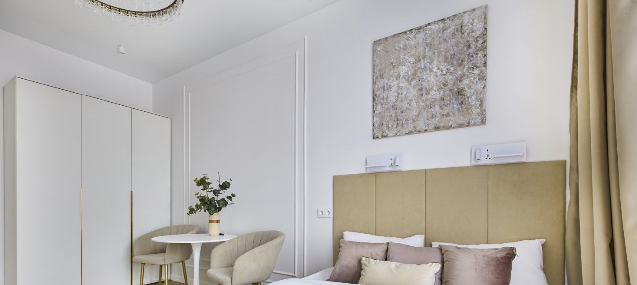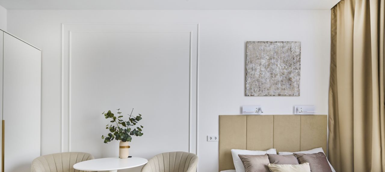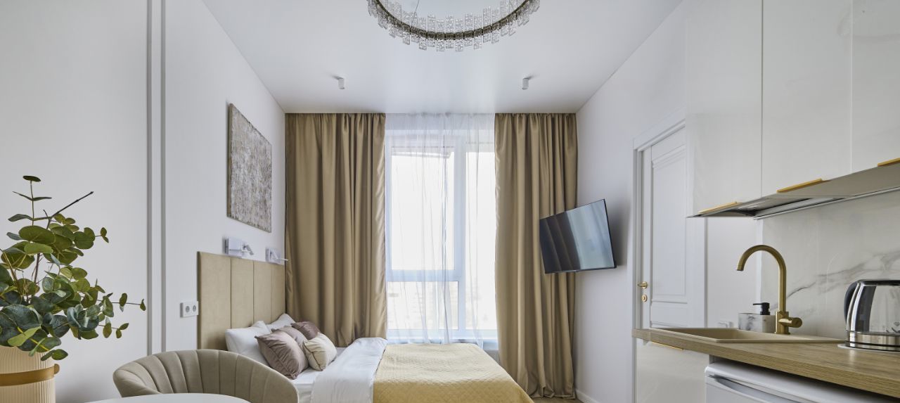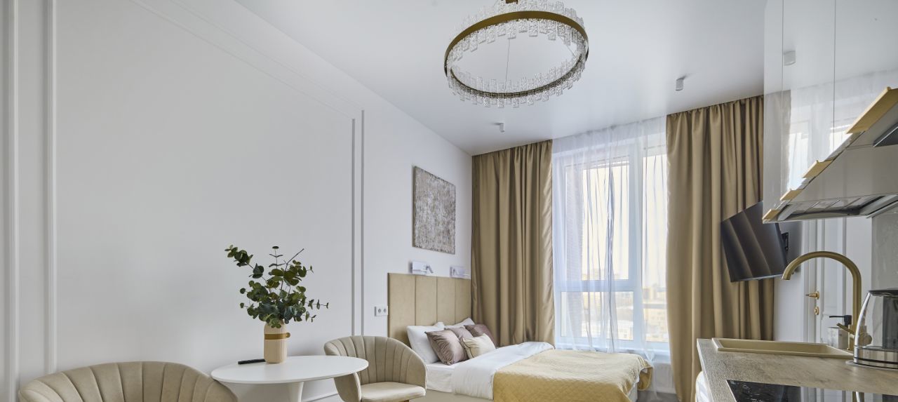 •Просторная студия с умной планировкой, которая позволяет зонировать пространство на уютную спальню, гостиную и рабочую область.