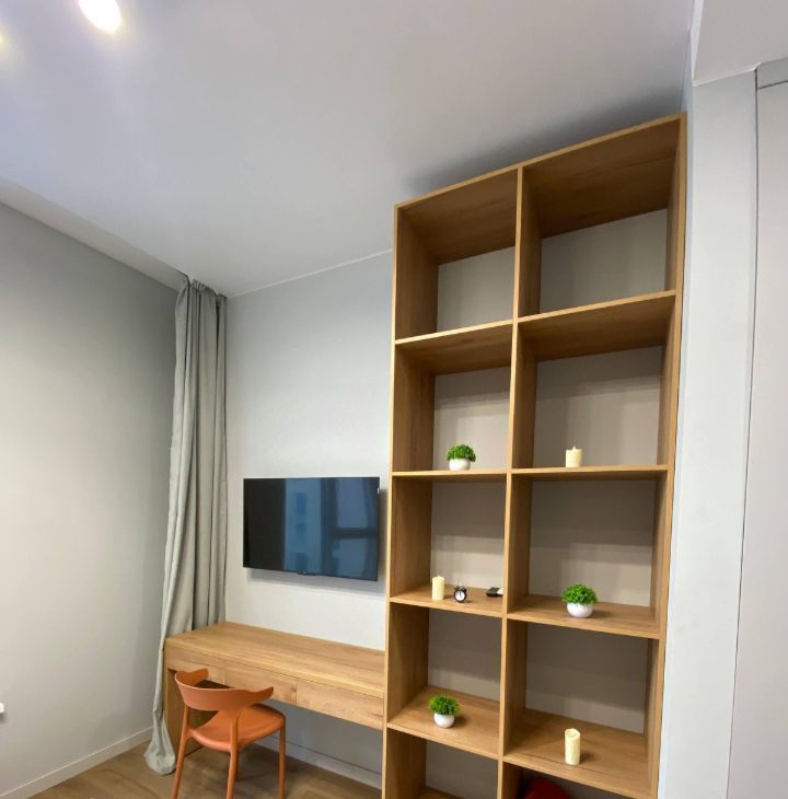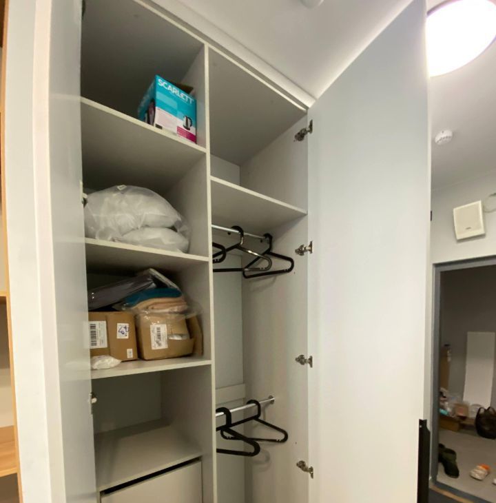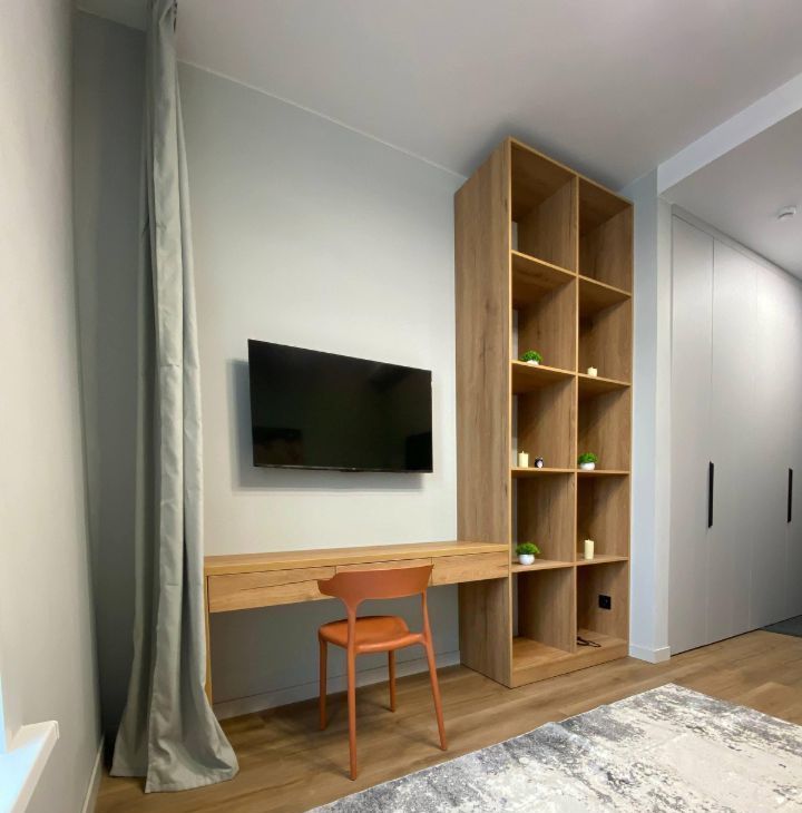 Есть все необходимое для комфортного проживания: стиральная машина, кондиционер, телевизор, рабочий стол, шкаф для вещей.
