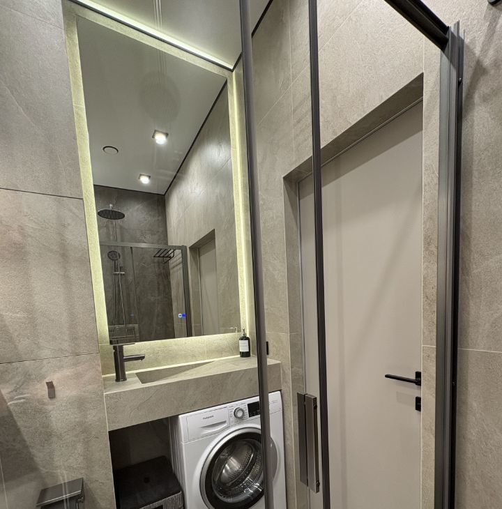 * Ванная: Дизайнерская сантехника, тропический душ, теплая стена, стиральная машина.