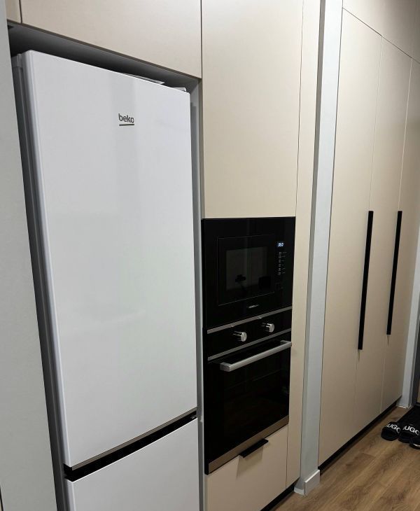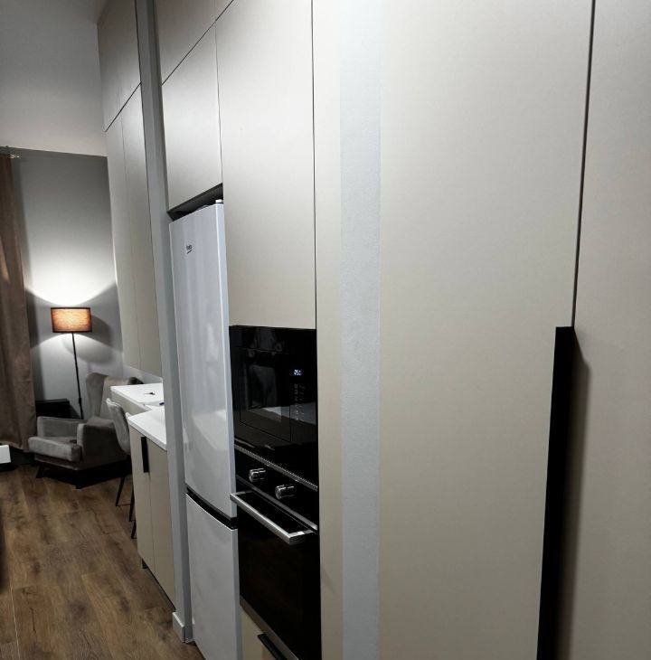 Кухня оборудована всей техникой для комфортного приготовления и употребления вкусной пищи. Холодильник, плита , вытяжка и микроволновка, чайник, кухонный стол со стульями.