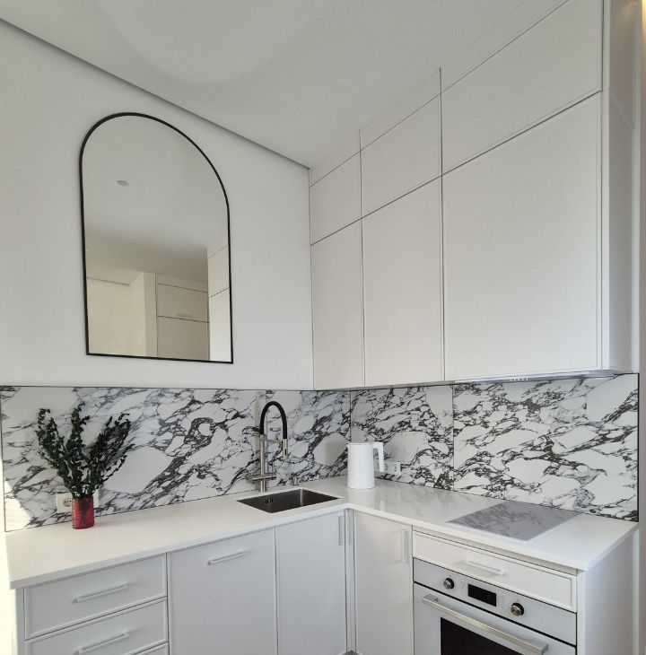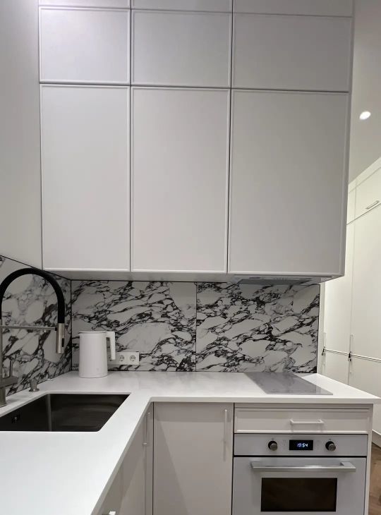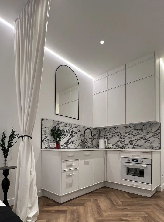Современный дизайнерский ремонт в минималистичной эстетике: светлая кухня с мраморным фартуком, тёплый деревянный пол ёлочкой, мягкое фактурное изголовье кровати, продуманная подсветка и спокойная цветовая гамма.