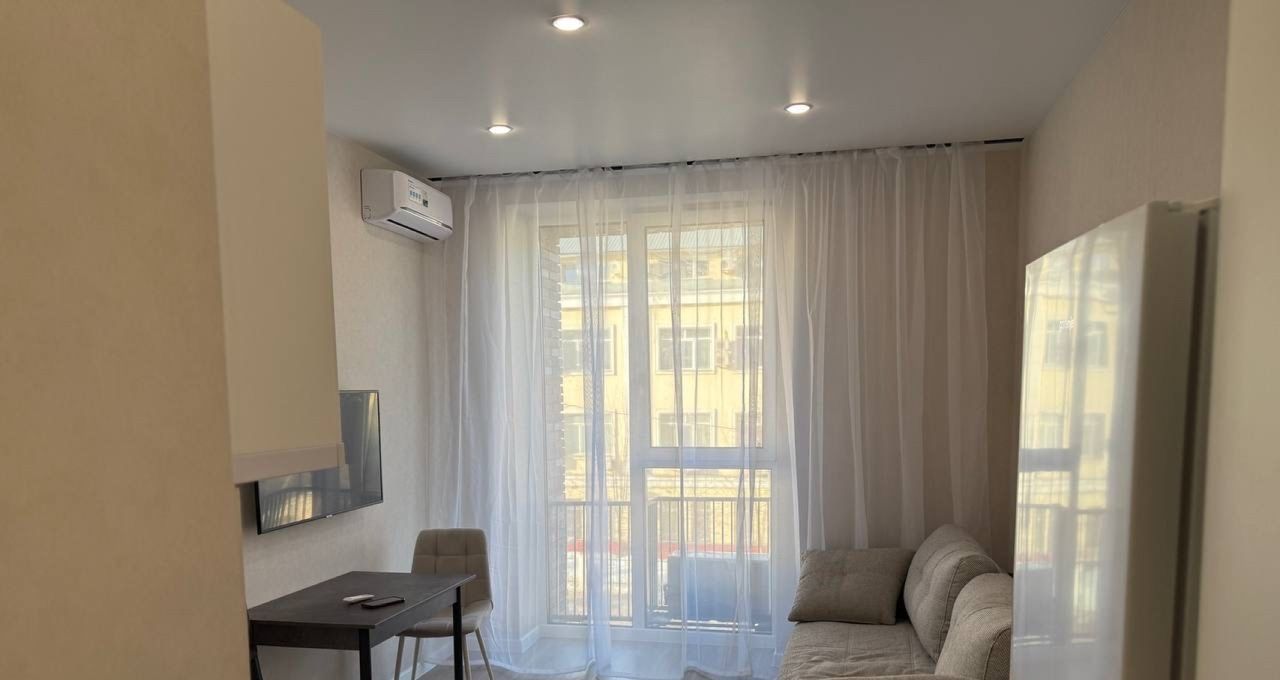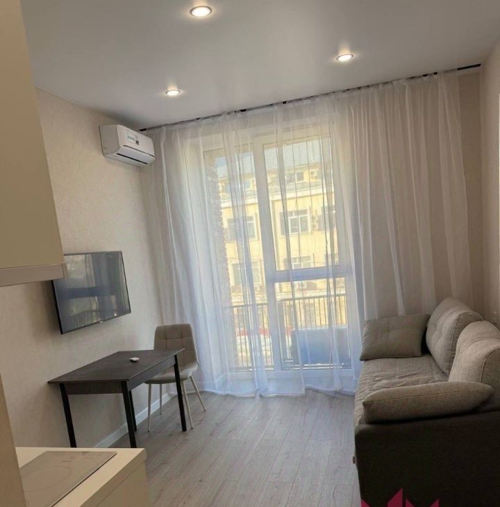 Дизайн и объем: Несмотря на компактные 20 кв. м, потолки 3 метра и панорамное остекление делают студию невероятно светлой и просторной. Современный ремонт, где каждый метр использован с умом.