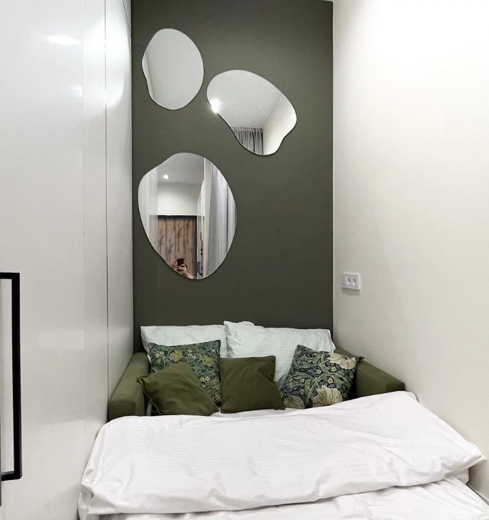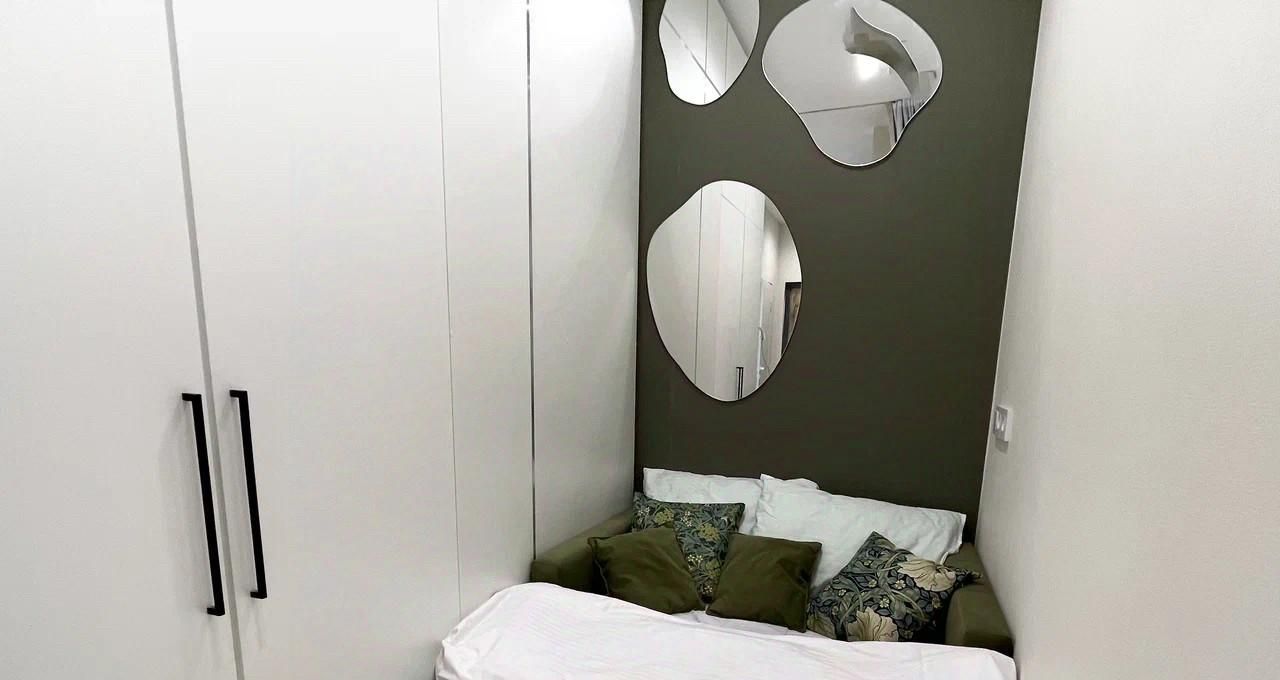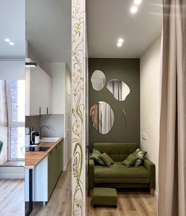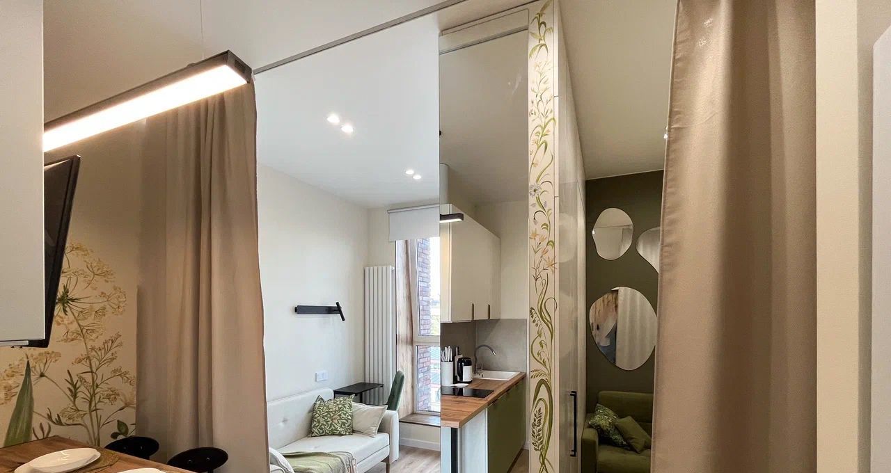 - 3 зоны: 1 спальная, 1 гостиная и кухня. Спальная и гостиная разделены вместительным шкафом, зона кухни отделена от двух комнат плотной шторой блэкаут;