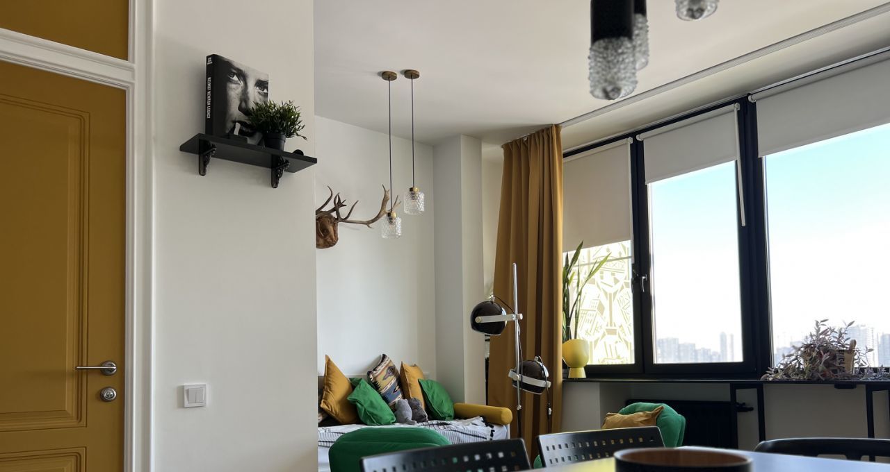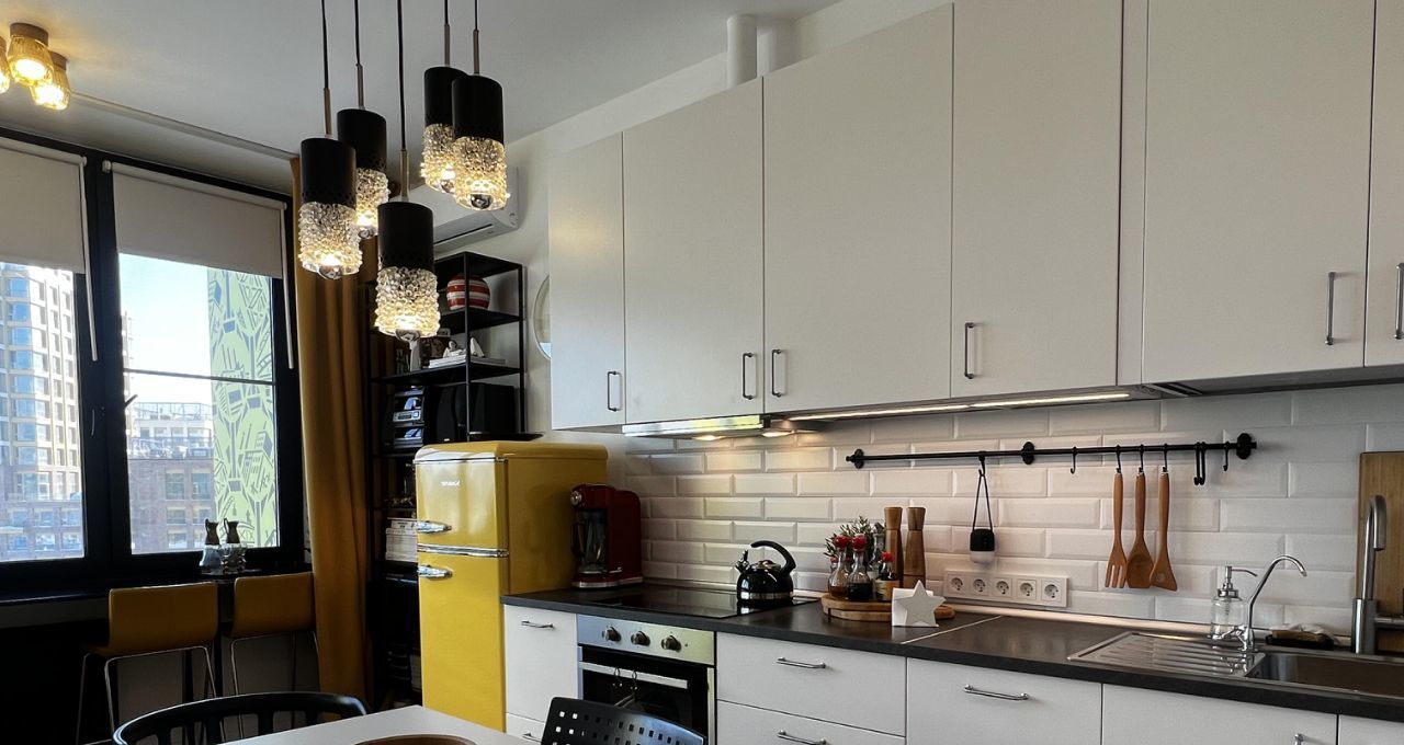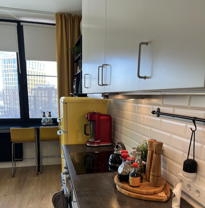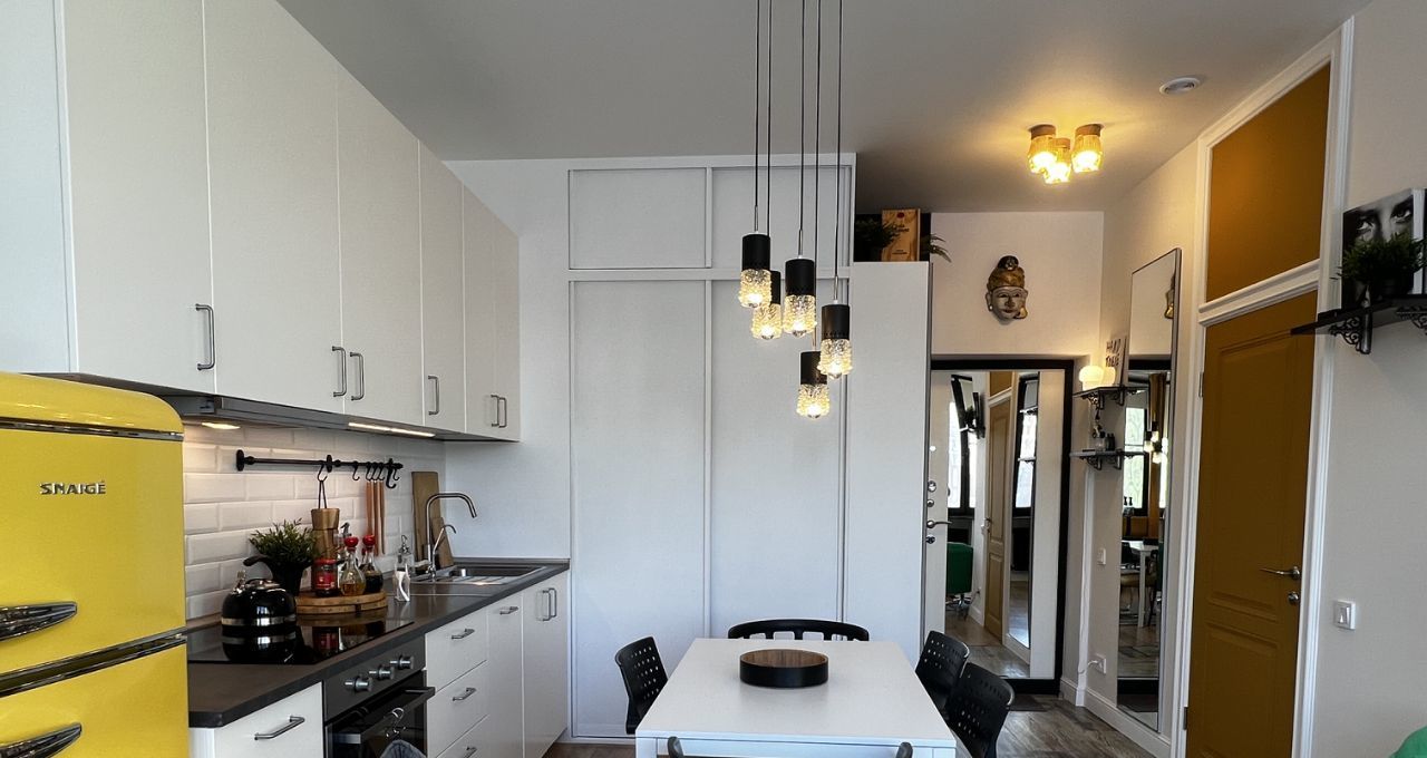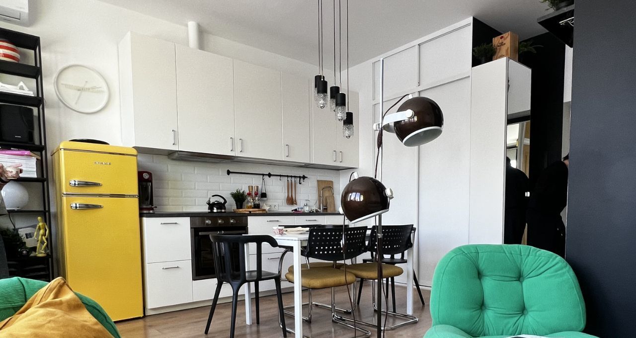 СТУДИЯ с продуманными зонами: удобная кухня, вся встроенная бытовая техника (духовой шкаф, варочная поверхность - индукция, вытяжка посудомоечная машина), классный желтый двухкамерный холодильник, обеденная группа, итальянские дизайнерский стулья. Везде по квартире — дорогие винтажные светильники!