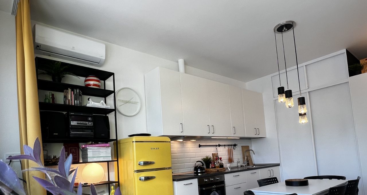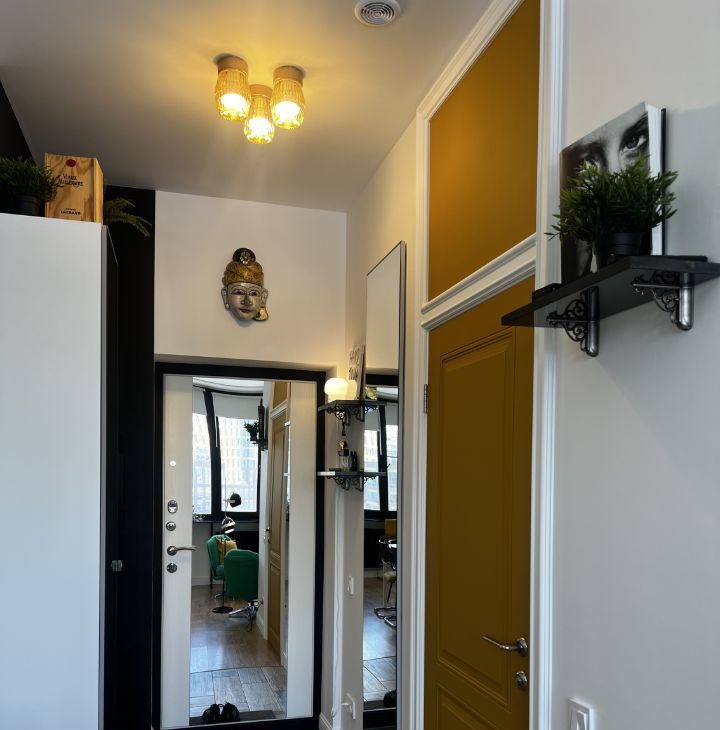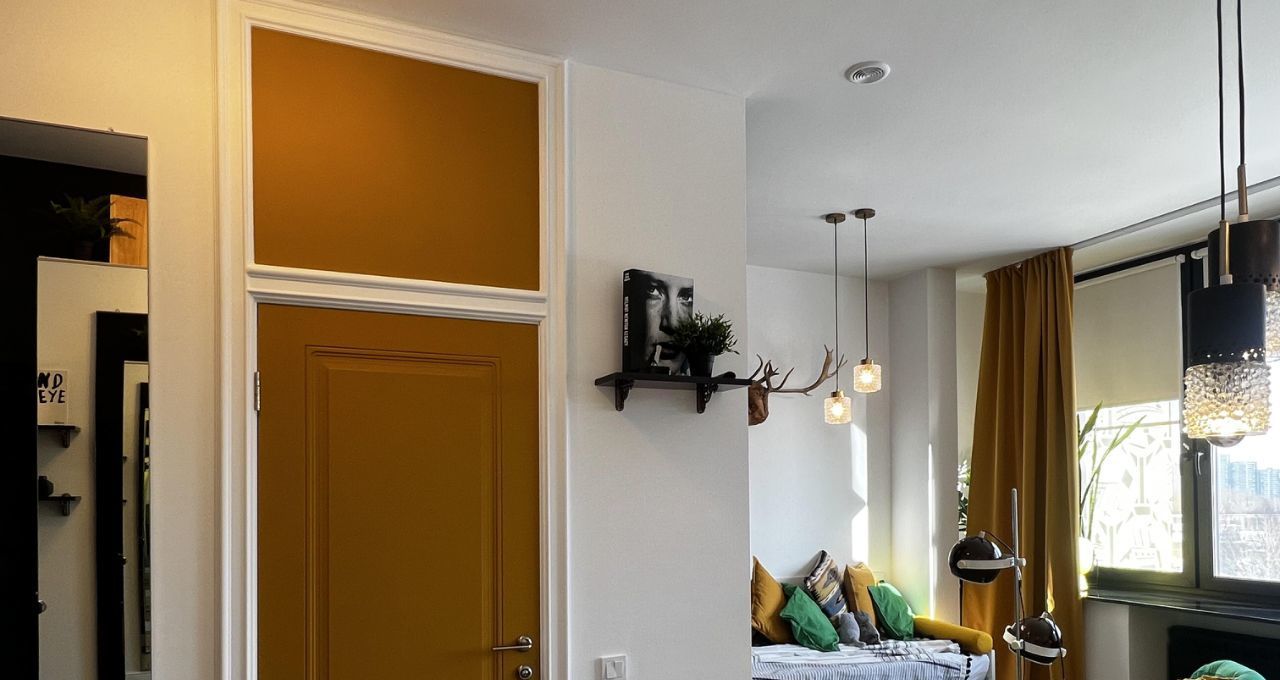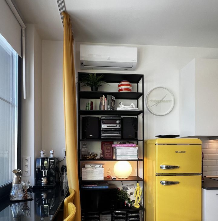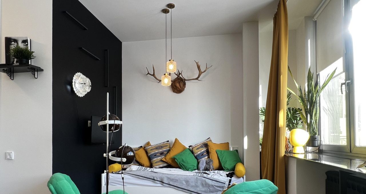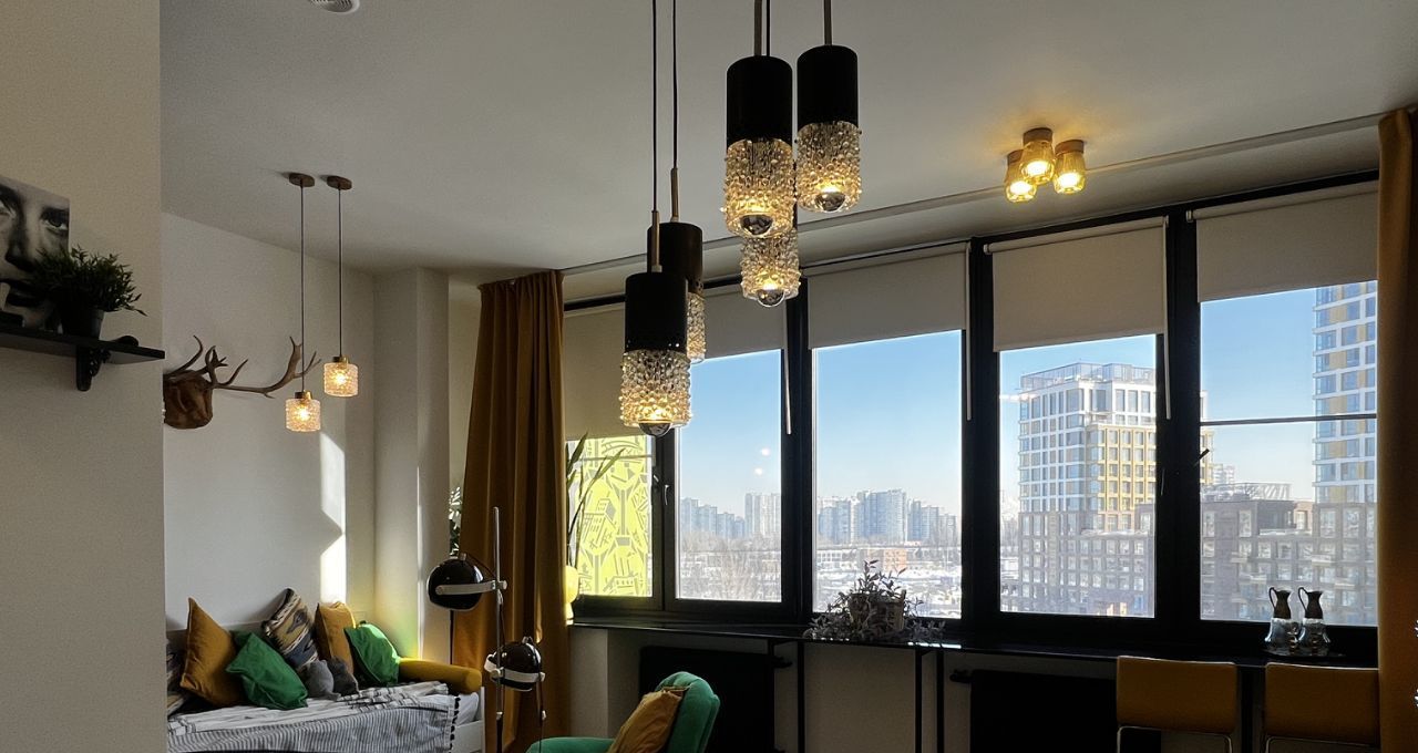 СТУДИЯ с продуманными зонами: удобная кухня, вся встроенная бытовая техника (духовой шкаф, варочная поверхность - индукция, вытяжка посудомоечная машина), классный желтый двухкамерный холодильник, обеденная группа, итальянские дизайнерский стулья. Везде по квартире — дорогие винтажные светильники!