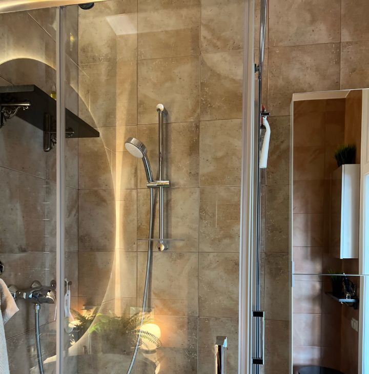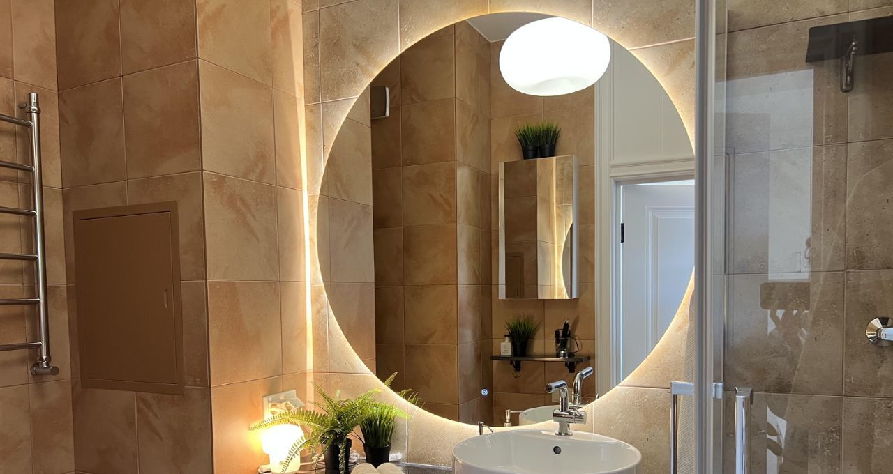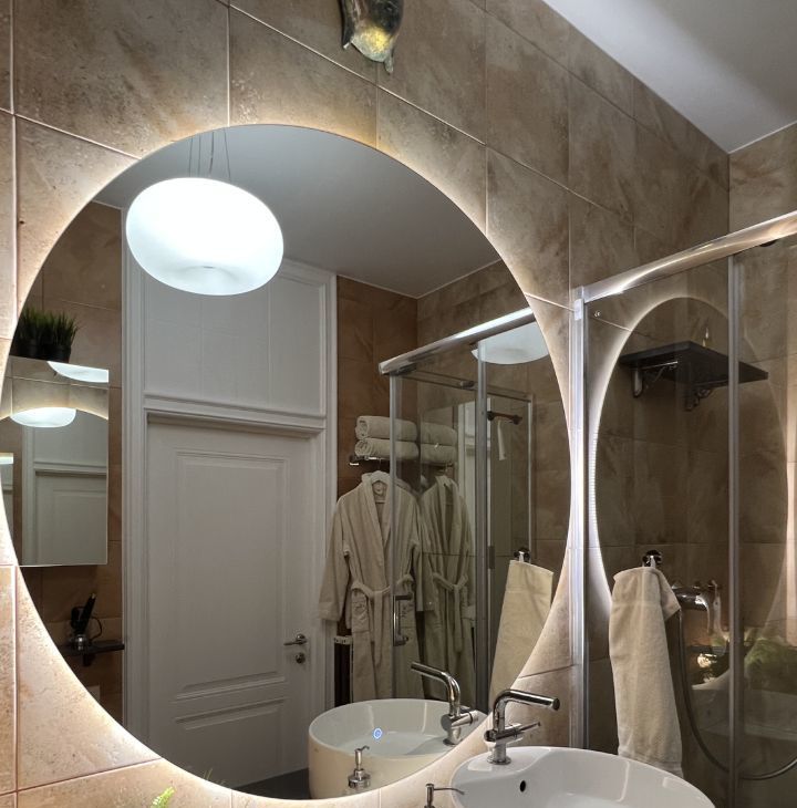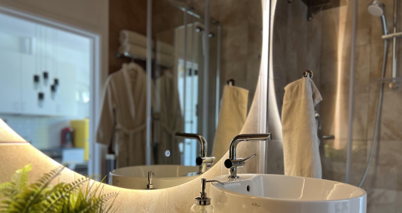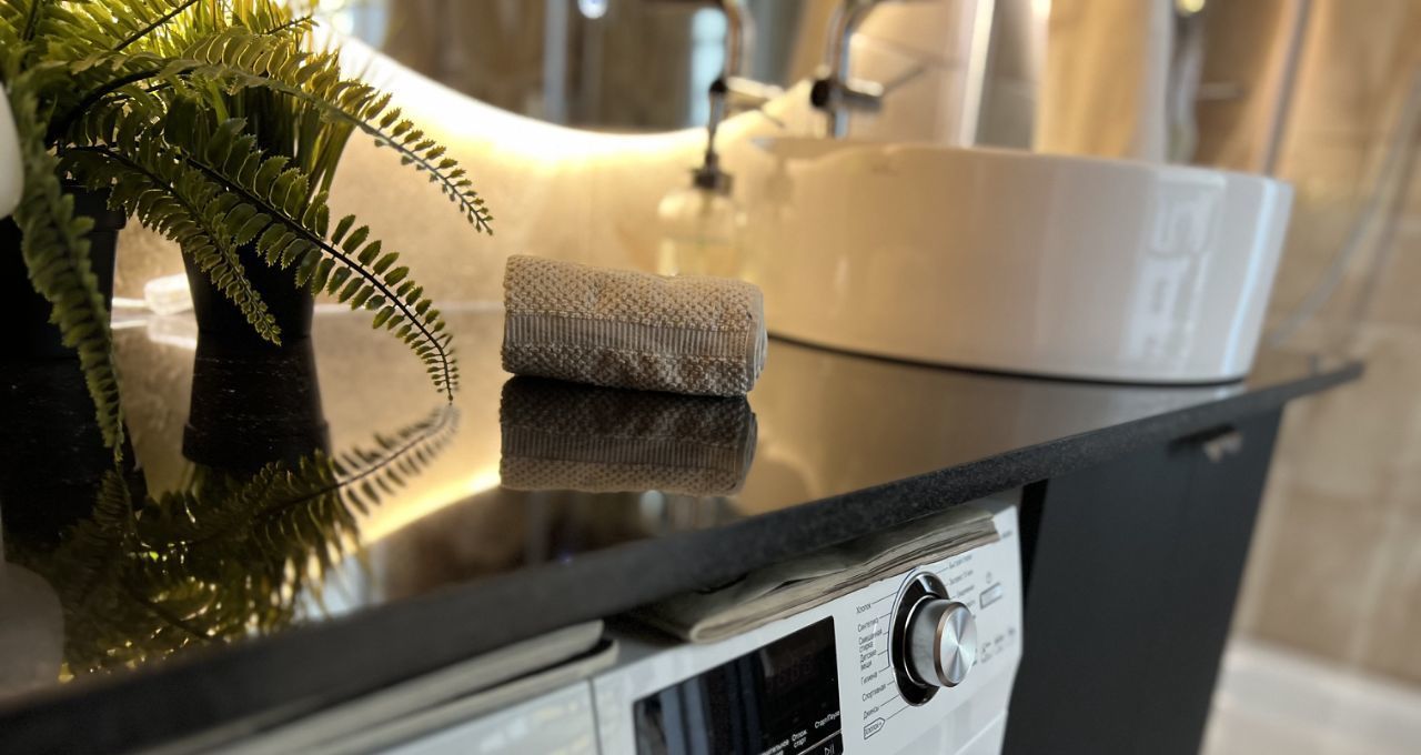 Большой САНУЗЕЛ — душевая, гигиенический душ, удобная широкая столешница из натурального камня, зеркало с подсветкой, стиральная машина, зеркальные шкафчики.