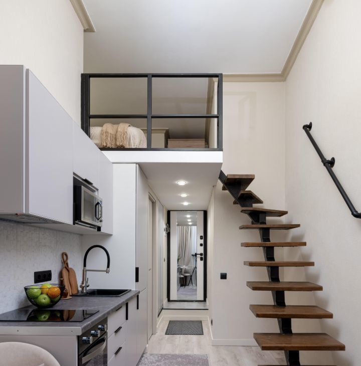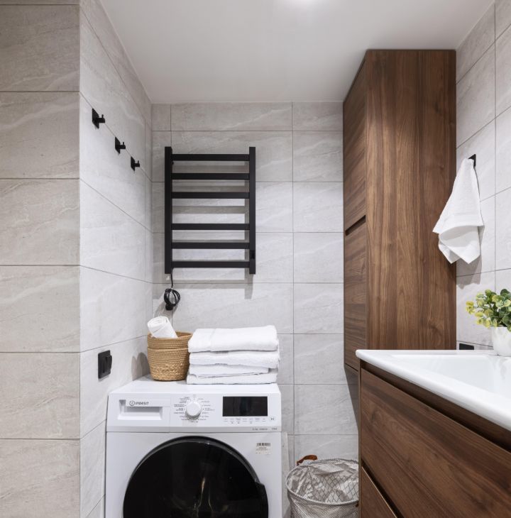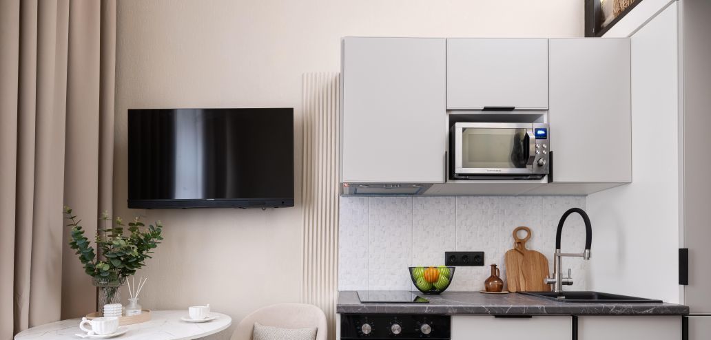 Техника: В комплекте всё необходимое: стиральная машина с функцией сушки, варочная панель/плита, микроволновая печь, встроенный холодильник, телевизор, сплит-система (кондиционер).