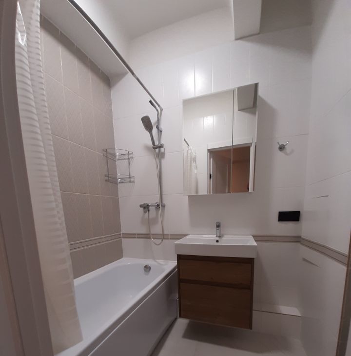 В квартире сделан качественный евроремонт, создающий современную и уютную атмосферу. Здесь есть вся необходимая мебель как в комнате, так и на кухне. Из техники — кондиционер, холодильник, телевизор и стиральная машина. Ванная комната оборудована ванной, что позволит вам расслабиться после длинного дня.