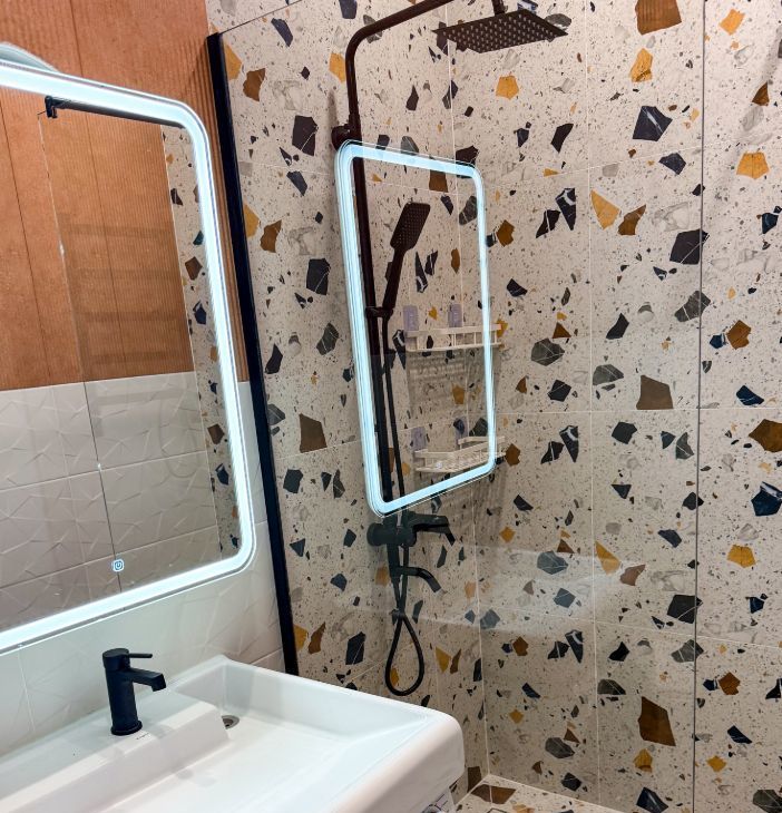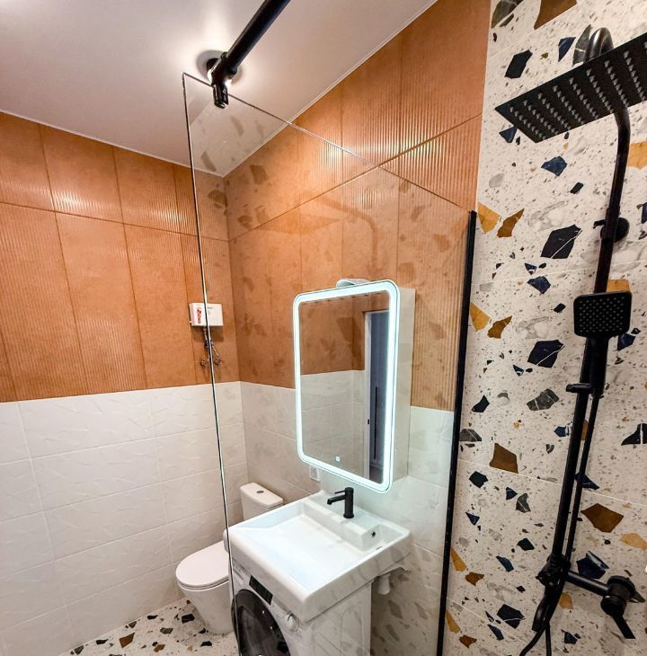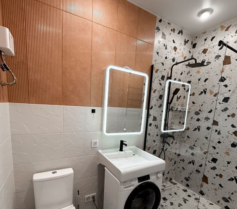 В ванной: душевой уголок, стиральная машинка, раковина, зеркальный шкаф с подсветкой.